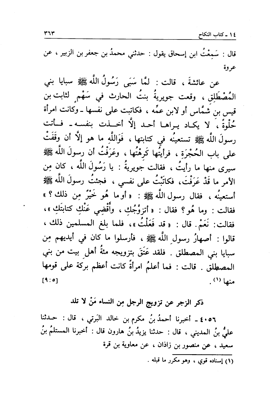 قال: سمعت بْنَ إِسْحَاقَ يَقُولُ: حَدَّثَنِي مُحَمَّدُ بْنُ جَعْفَرِ بْنِ الزُّبَيْرِ، عَنْ عُرْوَةَ، عَنْ عَائِشَةَ قَالَتْ: لَمَّا سَبَى رَسُولُ اللَّهِ صَلَّى اللَّهُ عَلَيْهِ وَسَلَّمَ سَبَايَا بَنِي الْمُصْطَلِقِ، وَقَعَتْ جُوَيْرِيَةُ بِنْتُ الْحَارِثِ فِي سَهْمٍ لِثَابِتِ بْنِ قَيْسِ بْنِ شَمَّاسٍ أَوْ لِابْنِ عَمِّهِ، فَكَاتَبَتْ عَلَى نَفْسِهَا -وَكَانَتِ امْرَأَةً حُلْوَةً لَا يَكَادُ يَرَاهَا أَحَدٌ إِلَّا أَخَذَتْ بِنَفْسِهِ- فَأَتَتْ رَسُولَ اللَّهِ صَلَّى اللَّهُ عَلَيْهِ وَسَلَّمَ تَسْتَعِينُهُ فِي كِتَابَتِهَا، فَوَاللَّهِ مَا هُوَ إِلَّا أَنْ وَقَفَتْ عَلَى بَابِ الْحُجْرَةِ، فَرَأَيْتُهَا كَرِهْتُهَا، وَعَرَفْتُ أَنَّ رَسُولَ اللَّهِ صَلَّى اللَّهُ عَلَيْهِ وَسَلَّمَ سَيَرَى مِنْهَا مَا رَأَيْتُ، فَقَالَتْ جُوَيْرِيَةُ: يَا رَسُولَ اللَّهِ، كَانَ مِنَ الْأَمْرِ مَا قَدْ عَرَفْتَ، فَكَاتَبْتُ عَلَى نَفْسِي، فَجِئْتُ رَسُولَ اللَّهِ صَلَّى اللَّهُ عَلَيْهِ وَسَلَّمَ أَسْتَعِينُهُ، فَقَالَ رَسُولُ اللَّهِ صَلَّى اللَّهُ عَلَيْهِ وَسَلَّمَ: "أَوَ مَا هُوَ خَيْرٌ مِنْ ذَلِكَ"، فَقَالَتْ: وَمَا هُوَ؟ فَقَالَ: "أَتَزَوَّجُكِ وَأَقْضِي عنك كتابك"، فَقَالَتْ: نَعَمْ. قَالَ: "قَدْ فَعَلْتُ" فَلَمَّا بَلَغَ الْمُسْلِمِينَ ذَلِكَ، قَالُوا: أَصْهَارُ رَسُولِ اللَّهِ صَلَّى الله عليه وسلم فأرسلوا ما كان بأيديهم مِنْ سَبَايَا بَنِي الْمُصْطَلِقِ. فَلَقَدْ عُتِقَ بِتَزْوِيجِهِ مِائَةُ أَهْلِ بَيْتٍ مِنْ بَنِي الْمُصْطَلِقِ. قَالَتْ: فَمَا أَعْلَمُ امْرَأَةً كَانَتْ أَعْظَمَ بَرَكَةً عَلَى قومها منها1. [9:5]