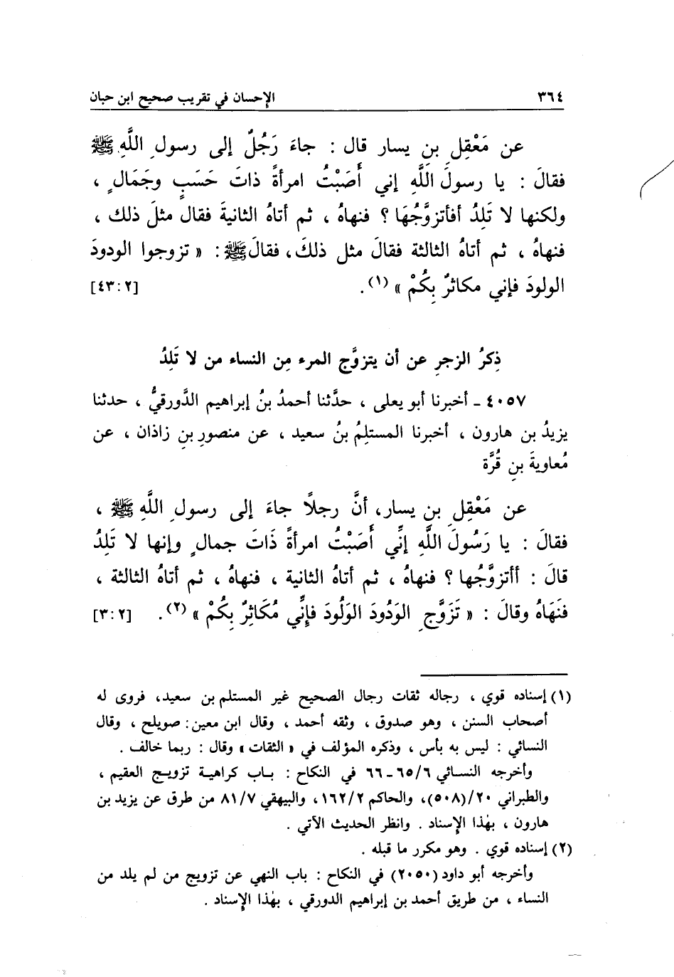 4057 - أَخْبَرَنَا أَبُو يَعْلَى، حَدَّثَنَا أَحْمَدُ بْنُ إِبْرَاهِيمَ الدَّوْرَقِيُّ، حَدَّثَنَا يَزِيدُ بْنُ هَارُونَ، أَخْبَرَنَا الْمُسْتَلِمُ بْنُ سَعِيدٍ، عَنْ مَنْصُورِ بْنِ زَاذَانَ، عَنْ مُعَاوِيَةَ بْنِ قُرَّةَ، عَنْ مَعْقِلِ بْنِ يَسَارٍ، أَنَّ رَجُلًا جَاءَ إِلَى رَسُولِ اللَّهِ صَلَّى اللَّهُ عَلَيْهِ وَسَلَّمَ، فَقَالَ: يَا رَسُولَ اللَّهِ إِنِّي أَصَبْتُ امْرَأَةً ذَاتَ جَمَالٍ وَإِنَّهَا لَا تَلِدُ، قَالَ: أَأَتَزَوَّجُهَا؟ فَنَهَاهُ، ثُمَّ أَتَاهُ الثَّانِيَةَ، فَنَهَاهُ، ثُمَّ أَتَاهُ الثَّالِثَةَ، فَنَهَاهُ وَقَالَ: "تَزَوَّجِ الْوَدُودَ الْوَلُودَ فَإِنِّي مُكَاثِرٌ بِكُمْ" 1. [3:2]