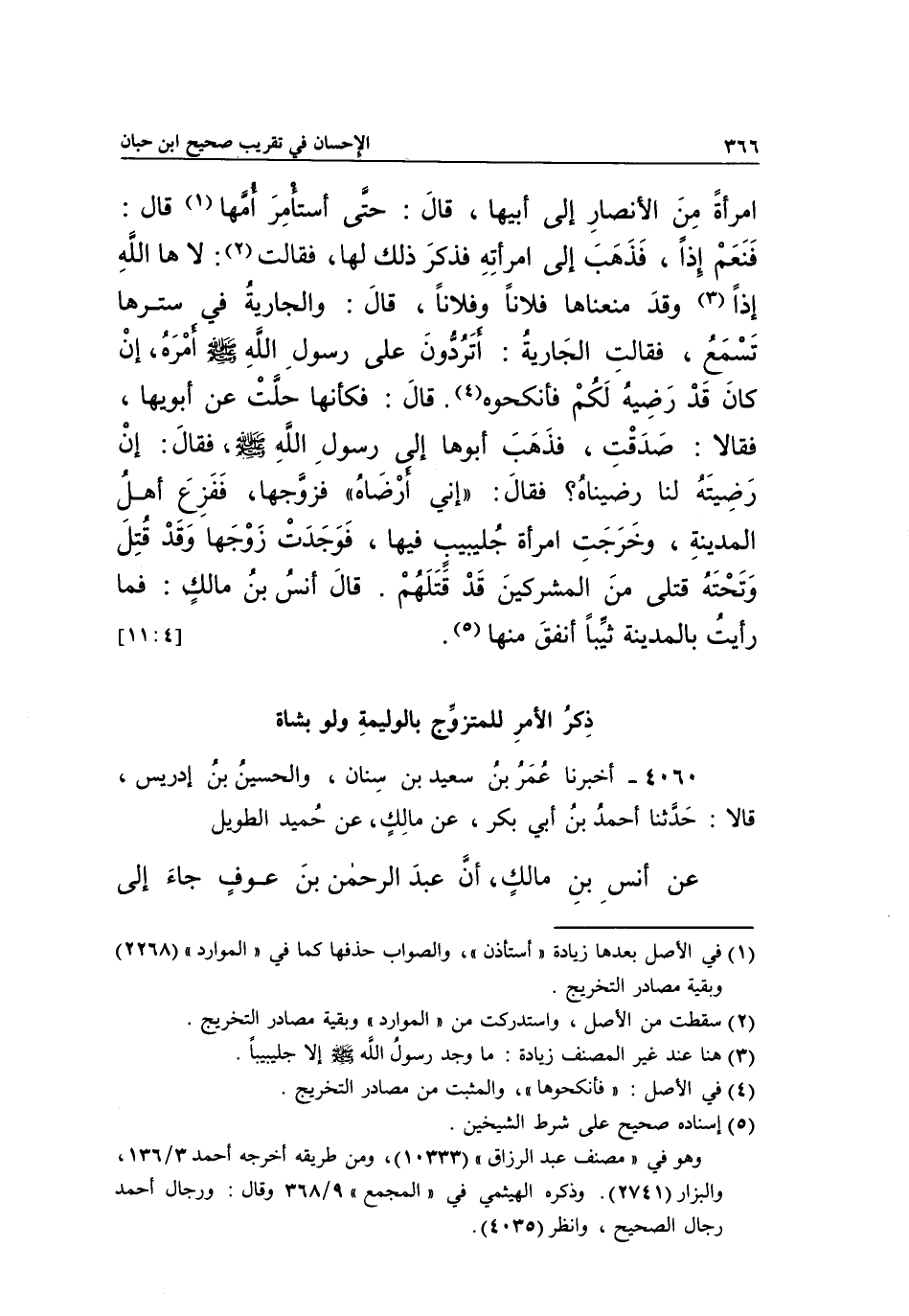 4060 - أَخْبَرَنَا عُمَرُ بْنُ سَعِيدِ بْنِ سِنَانٍ وَالْحُسَيْنُ بْنُ إِدْرِيسَ، قَالَا: حَدَّثَنَا أَحْمَدُ بْنُ أَبِي بَكْرٍ، عَنْ مَالِكٍ، عَنْ حُمَيْدٌ الطَّوِيلُ، عَنْ أَنَسِ بْنِ مَالِكٍ، أَنَّ عَبْدَ الرَّحْمَنِ بْنَ عوف جاء إلىذكر الأمر للمتزوج بوليمة ولو شاة