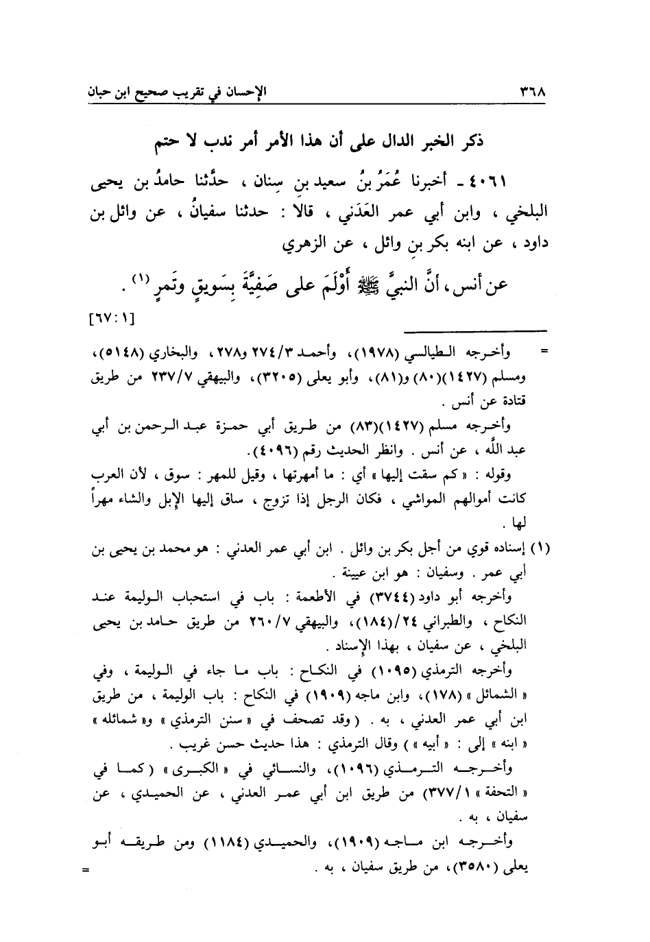 4061 - أَخْبَرَنَا عُمَرُ بْنُ سَعِيدِ بْنِ سِنَانٍ، حَدَّثَنَا حَامِدُ بْنُ يَحْيَى الْبَلْخِيُّ، وَابْنُ أَبِي عُمَرَ الْعَدَنِيُّ، قَالَا: حَدَّثَنَا سُفْيَانُ، عَنْ وَائِلِ بْنِ دَاوُدَ، عَنِ ابْنِهِ بَكْرِ بْنِ وَائِلٍ، عَنِ الزُّهْرِيِّ، عَنْ أَنَسٍ أَنَّ النَّبِيَّ صَلَّى اللَّهُ عَلَيْهِ وَسَلَّمَ أَوْلَمَ على صفية بسويق وتمر1. [67:1]