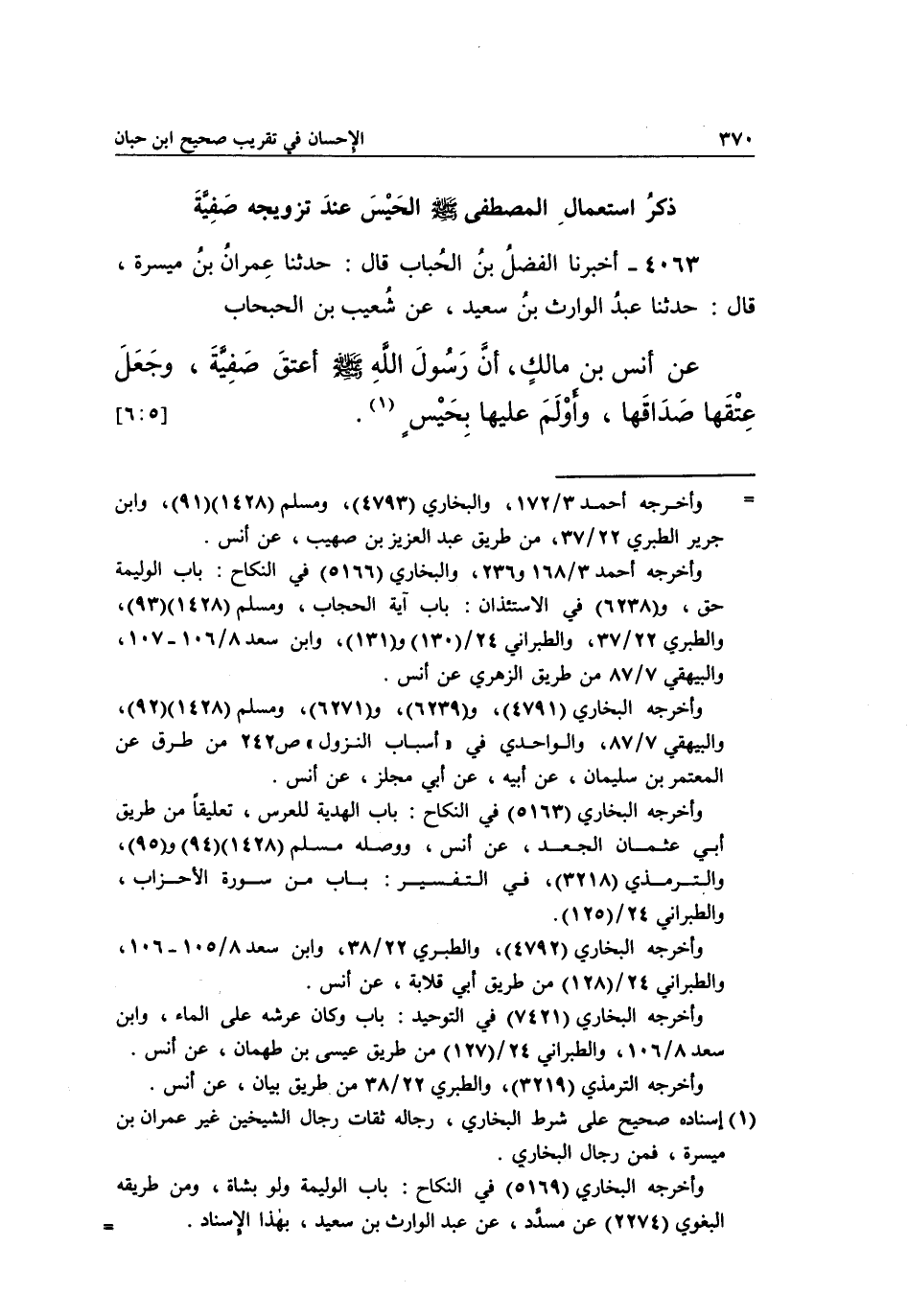 4063 - أَخْبَرَنَا الْفَضْلُ بْنُ الْحُبَابِ قَالَ: حَدَّثَنَا عِمْرَانُ بْنُ مَيْسَرَةَ، قَالَ: حَدَّثَنَا عَبْدُ الْوَارِثِ بْنُ سَعِيدٍ، عَنْ شُعَيْبِ بْنِ الْحَبْحَابِ، عَنْ أَنَسِ بْنِ مَالِكٍ أَنَّ رَسُولَ اللَّهِ صَلَّى اللَّهُ عَلَيْهِ وسلم أعتق صَفِيَّةَ، وَجَعَلَ عِتْقَهَا صَدَاقَهَا، وَأَوْلَمَ عَلَيْهَا بِحَيْسٍ1. [6:5]