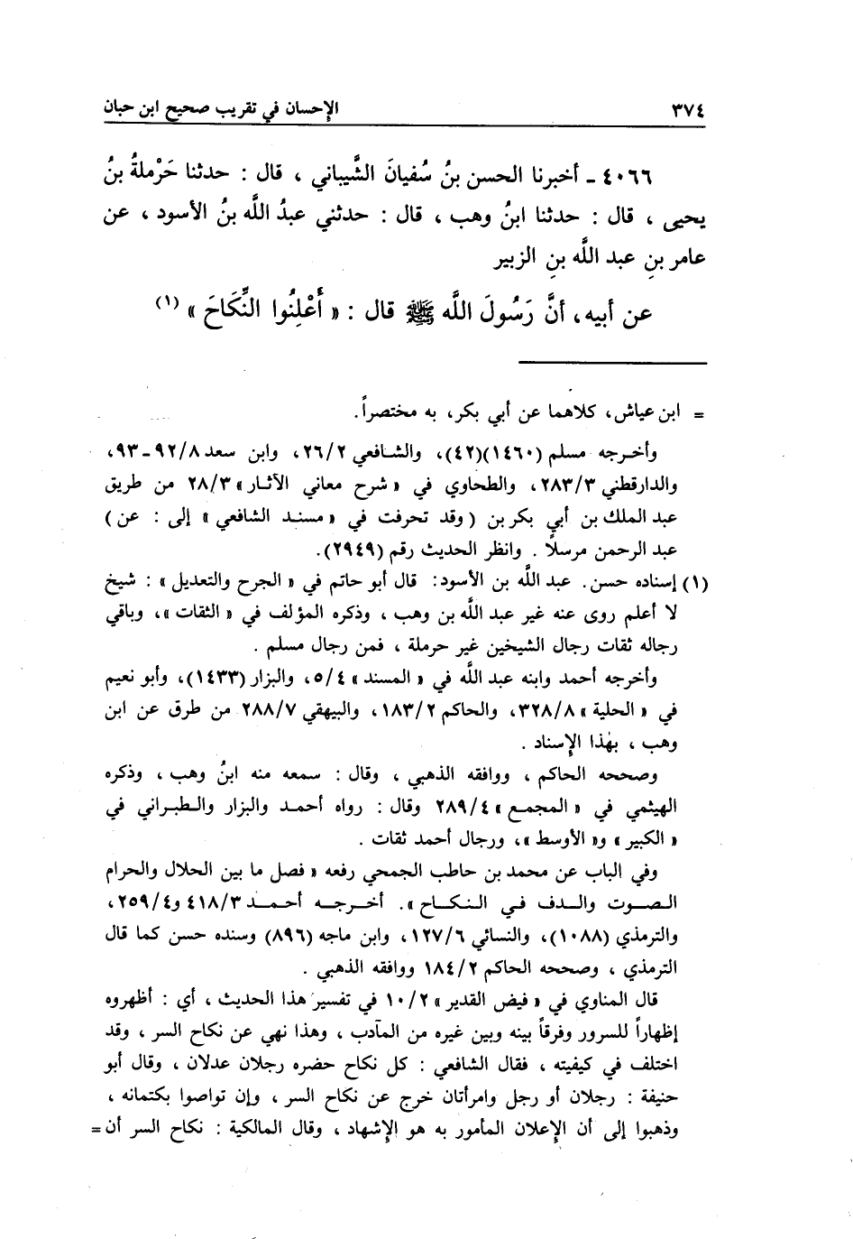 4066 - أَخْبَرَنَا الْحَسَنُ بْنُ سُفْيَانَ الشَّيْبَانِيُّ، قَالَ: حَدَّثَنَا حَرْمَلَةُ بْنُ يَحْيَى، قَالَ: حَدَّثَنَا بن وَهْبٍ، قَالَ: حَدَّثَنِي عَبْدُ اللَّهِ بْنُ الْأَسْوَدِ، عَنْ عَامِرِ بْنِ عَبْدِ اللَّهِ بْنِ الزُّبَيْرِ، عَنْ أَبِيهِ أَنَّ رَسُولَ اللَّهِ صَلَّى اللَّهُ عليه وسلم قال: "أعلنوا النكاح" 1.