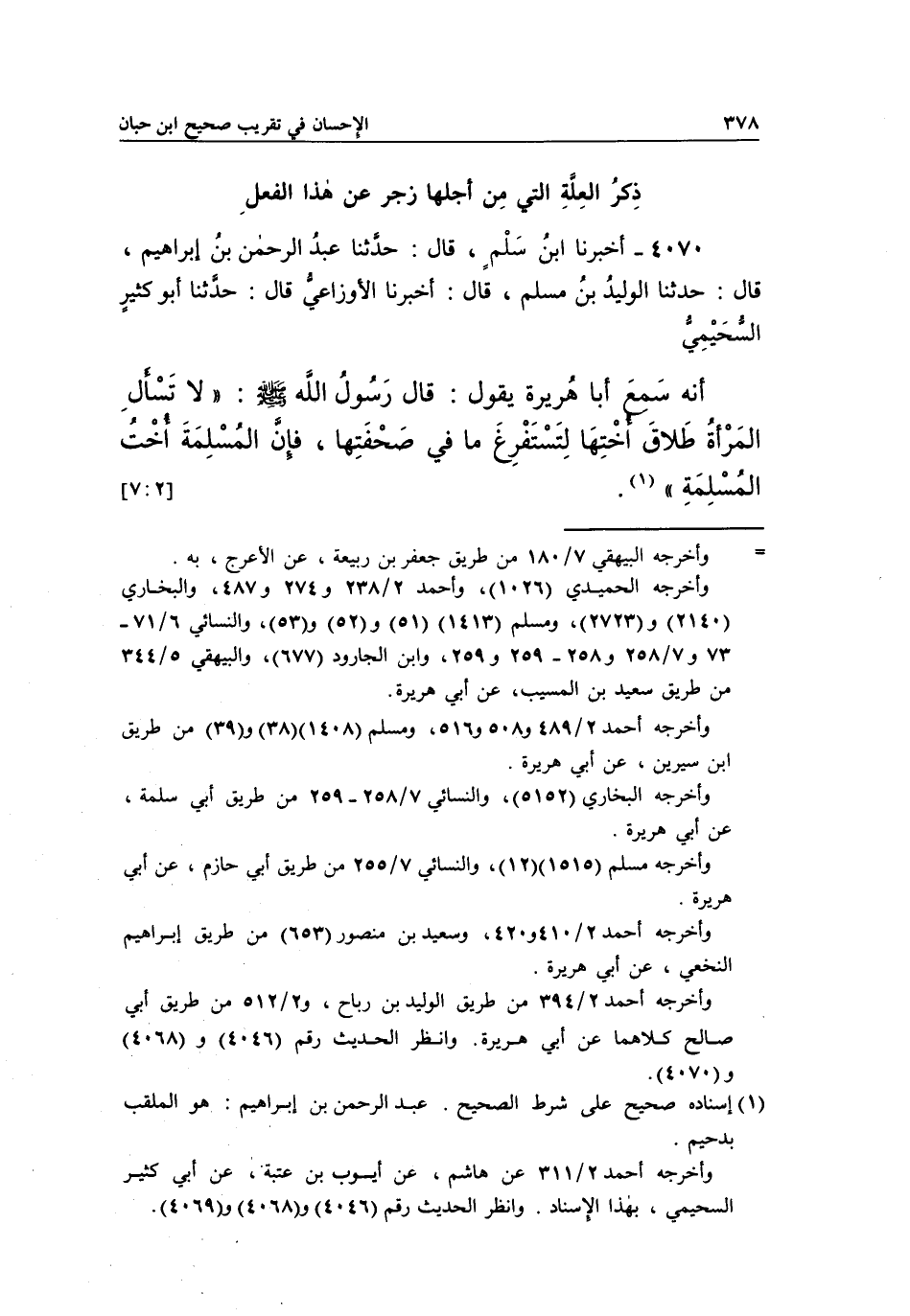 4070 - أخبرنا بْنِ سَلْمٍ، قَالَ: حَدَّثَنَا عَبْدُ الرَّحْمَنِ بْنُ إِبْرَاهِيمَ، قَالَ: حَدَّثَنَا الْوَلِيدُ بْنُ مُسْلِمٍ، قَالَ: أَخْبَرَنَا الْأَوْزَاعِيُّ، قَالَ: حَدَّثَنَا أَبُو كَثِيرٍ السُّحَيْمِيُّ، أَنَّهُ سَمِعَ أَبَا هُرَيْرَةَ يَقُولُ: قَالَ رَسُولُ اللَّهِ صَلَّى اللَّهُ عَلَيْهِ وَسَلَّمَ: "لَا تَسْأَلِ الْمَرْأَةُ طَلَاقَ أُخْتِهَا لِتَسْتَفْرِغَ مَا فِي صَحْفَتِهَا، فإن المسلمة أخت المسلمة" 1. [7:2]