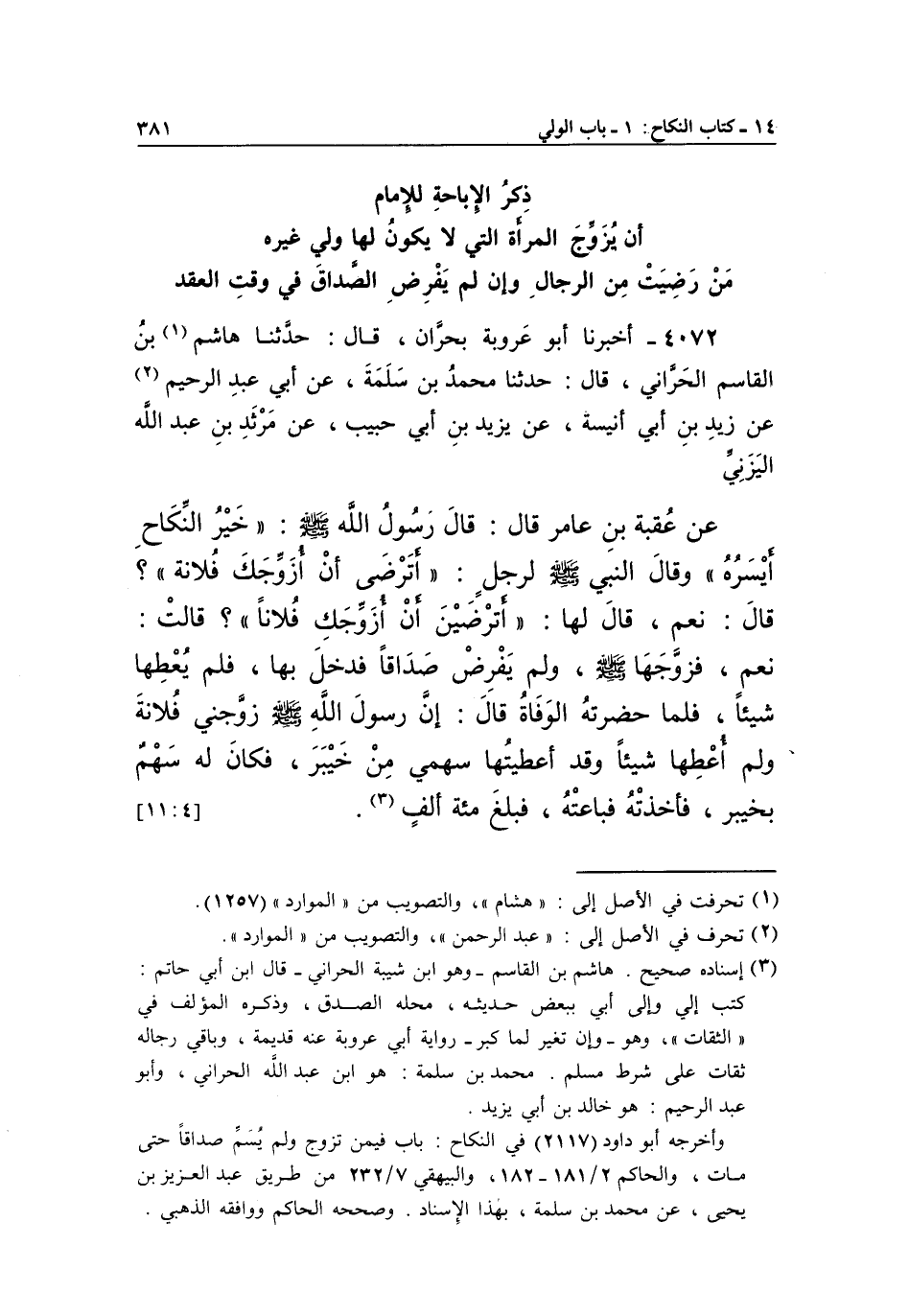 4072 - أَخْبَرَنَا أَبُو عَرُوبَةَ بِحَرَّانَ، قَالَ: حَدَّثَنَا هَاشِمُ1 بْنُ الْقَاسِمِ الْحَرَّانِيُّ، قَالَ: حَدَّثَنَا مُحَمَّدُ بْنُ سَلَمَةَ، عَنْ أَبِي عَبْدِ الرَّحِيمِ2، عَنْ زَيْدِ بْنِ أَبِي أُنَيْسَةَ، عَنْ يَزِيدَ بْنِ أَبِي حَبِيبٍ، عَنْ مَرْثَدِ بْنِ عَبْدِ اللَّهِ الْيَزَنِيُّ، عَنْ عُقْبَةَ بْنِ عَامِرٍ، قَالَ: قال صَلَّى اللَّهُ عَلَيْهِ وَسَلَّمَ: "خَيْرُ النِّكَاحِ أَيْسَرُهُ". وَقَالَ النَّبِيُّ صَلَّى اللَّهُ عَلَيْهِ وَسَلَّمَ لِرَجُلٍ: "أَتَرْضَى أَنْ أُزَوِّجَكَ فُلَانَةً؟ " قَالَ: نَعَمْ، قَالَ لَهَا: "أَتَرْضَيْنَ أَنْ أُزَوِّجَكَ فُلَانًا؟ " قَالَتْ: نَعَمْ، فَزَوَّجَهَا رَسُولُ اللَّهِ صَلَّى اللَّهُ عَلَيْهِ وَسَلَّمَ، وَلَمْ يَفْرِضْ صَدَاقًا فَدَخَلَ بِهَا، فَلَمْ يُعْطِهَا شَيْئًا، فَلَمَّا حَضَرَتْهُ الْوَفَاةُ قَالَ: إِنَّ رَسُولَ اللَّهِ صَلَّى اللَّهُ عَلَيْهِ وَسَلَّمَ زَوَّجَنِي فُلَانَةً وَلَمْ أَعْطِهَا شَيْئًا وَقَدْ أُعْطِيتُهَا سَهْمِي مِنْ خَيْبَرَ، فَكَانَ لَهُ سَهْمٌ بِخَيْبَرَ، فَأَخَذَتْهُ فَبَاعَتْهُ، فبلغ مائة ألف3. [11:4]