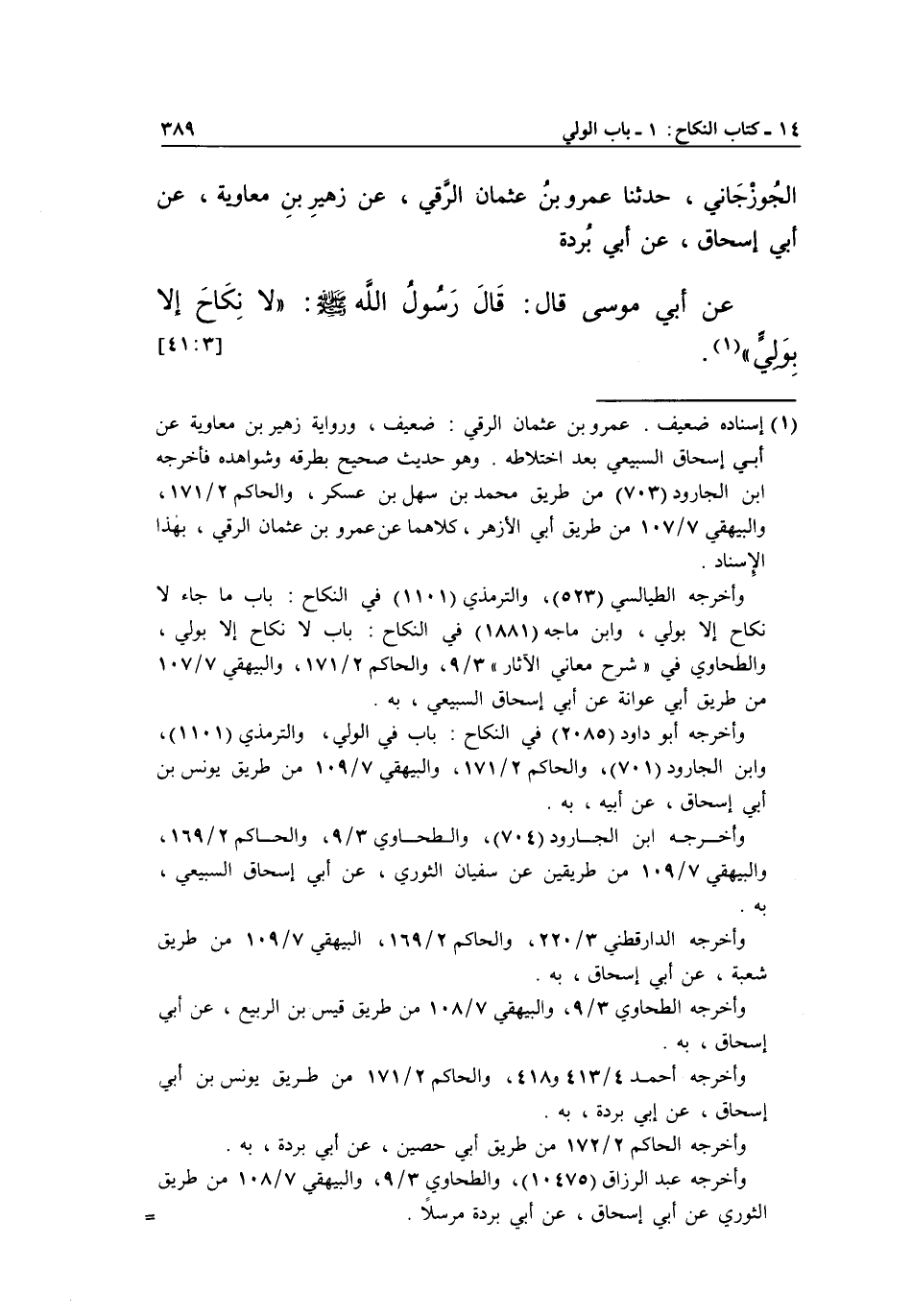 الْجُوزْجَانِيُّ، حَدَّثَنَا عَمْرُو بْنُ عُثْمَانَ الرَّقِّيُّ، عَنْ زُهَيْرُ بْنُ مُعَاوِيَةَ، عَنْ أَبِي إِسْحَاقَ، عَنْ أَبِي بُرْدَةَ، عَنْ أَبِي مُوسَى قَالَ: قَالَ رَسُولُ اللَّهِ صَلَّى اللَّهُ عَلَيْهِ وَسَلَّمَ: "لَا نكاح إلا بولي" 1. [41:3]