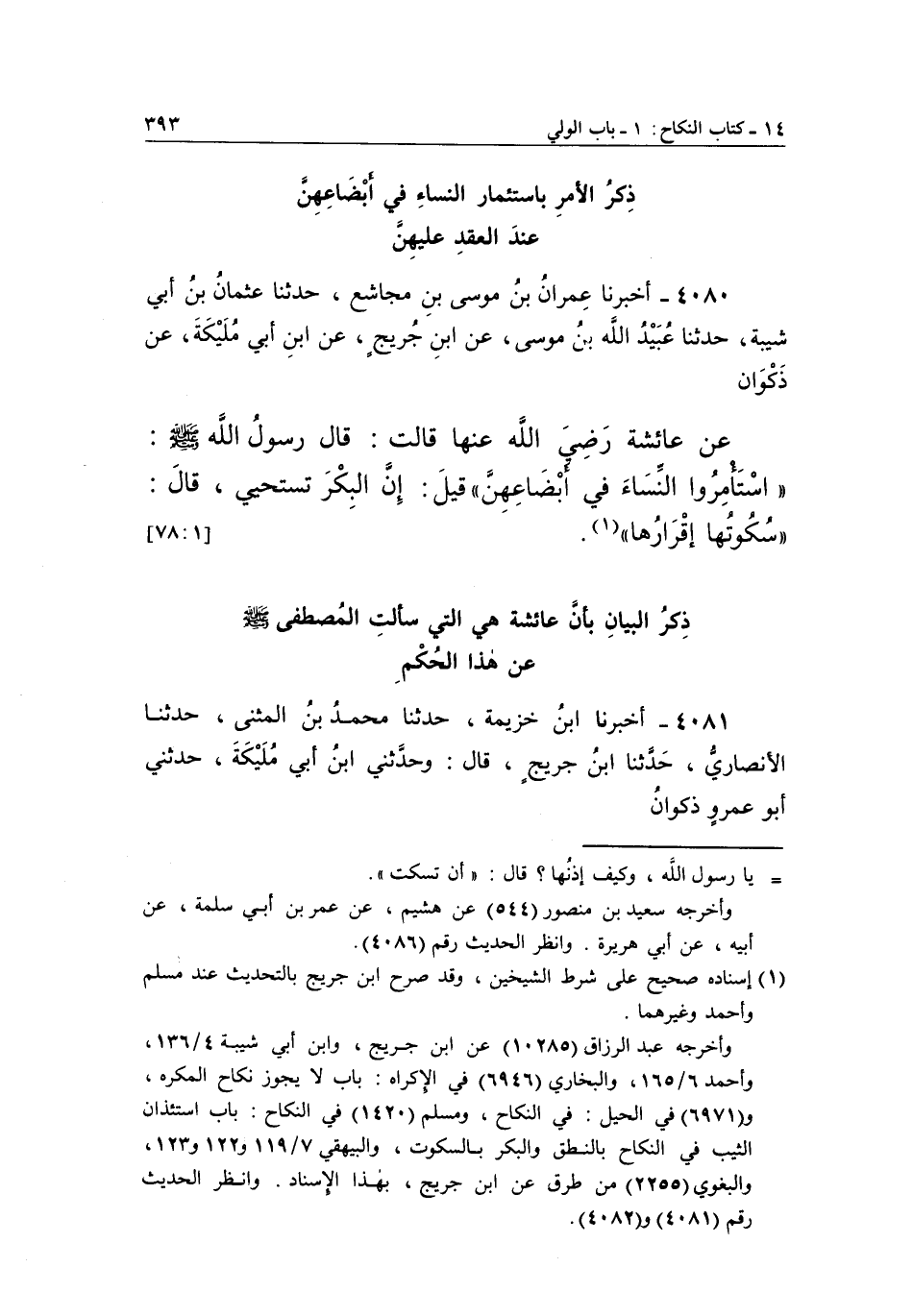 4080 - أَخْبَرَنَا عِمْرَانُ بْنُ مُوسَى بْنِ مُجَاشِعٍ، حَدَّثَنَا عُثْمَانُ بْنُ أَبِي شَيْبَةَ، حَدَّثَنَا عُبَيْدُ اللَّهِ بْنُ مُوسَى، عَنِ ابْنِ جُرَيْجٍ، عَنِ ابْنِ أَبِي مُلَيْكَةَ، عَنْ ذَكْوَانَ عَنْ عائشة رضى الله تعالى عَنْهَا قَالَتْ: قَالَ رَسُولُ اللَّهِ صَلَّى اللَّهُ عَلَيْهِ وَسَلَّمَ: "اسْتَأْمِرُوا النِّسَاءَ فِي أَبْضَاعِهِنَّ"، قِيلَ: إن البكر تستحي، قال: "سكوتها إقرارها" 1. [78:1]
