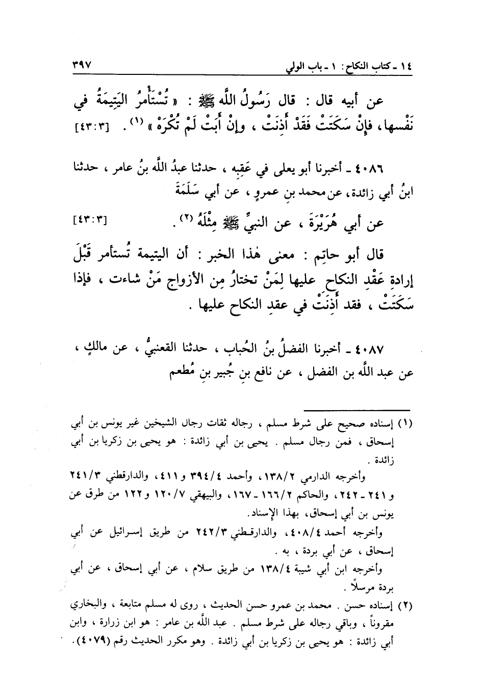 عَنْ أَبِيهِ، قَالَ: قَالَ رَسُولُ اللَّهِ صَلَّى اللَّهُ عَلَيْهِ وَسَلَّمَ: "تُسْتَأْمَرُ الْيَتِيمَةُ فِي نَفْسِهَا، فَإِنْ سَكَتَتْ فَقَدْ أَذِنَتْ، وَإِنْ أَبَتْ لَمْ تكره" 1. [43:3]