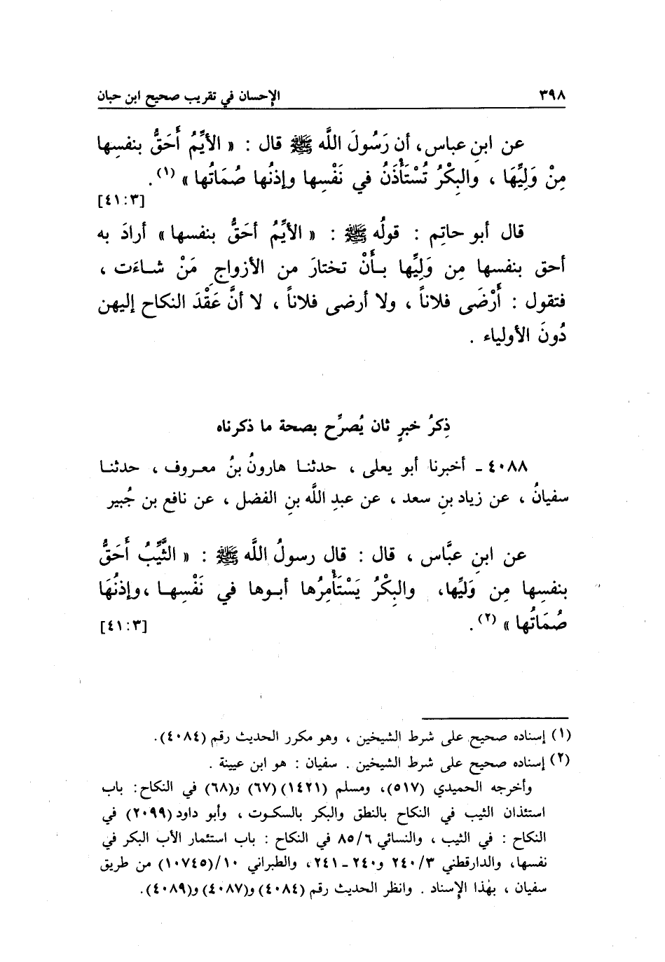4088 - أَخْبَرَنَا أَبُو يَعْلَى، حَدَّثَنَا هَارُونُ بْنُ مَعْرُوفٍ، حَدَّثَنَا سُفْيَانُ، عَنْ زِيَادِ بْنِ سَعْدٍ، عَنْ عبد الله بن الفضل، عن نافع بن جبير، عن بْنِ عَبَّاسٍ قَالَ: قَالَ رَسُولُ اللَّهِ صَلَّى اللَّهُ عَلَيْهِ وَسَلَّمَ: "الثَّيِّبُ أَحَقُّ بِنَفْسِهَا مِنْ وَلِيِّهَا، وَالْبِكْرُ يَسْتَأْمِرُهَا أَبُوهَا فِي نَفْسِهَا، وَإِذْنُهَا صُمَاتُهَا" 1. [41:3]