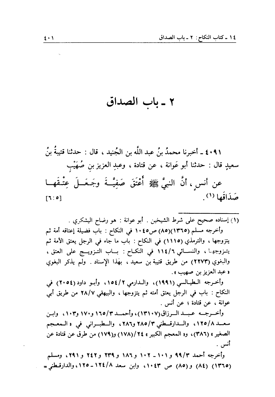 4091 - أَخْبَرَنَا مُحَمَّدُ بْنُ عَبْدِ اللَّهِ بْنِ الْجُنَيْدِ، قَالَ: حَدَّثَنَا قُتَيْبَةُ بْنُ سَعِيدٍ، قَالَ: حَدَّثَنَا أَبُو عَوَانَةَ، عَنْ قَتَادَةَ، وَعَبْدِ الْعَزِيزِ بْنِ صُهَيْبٍ، عَنْ أَنَسٍ أَنَّ النَّبِيَّ صَلَّى اللَّهُ عَلَيْهِ وَسَلَّمَ أَعْتَقَ صَفِيَّةَ وَجَعَلَ عتقها صداقها1. [6:5]