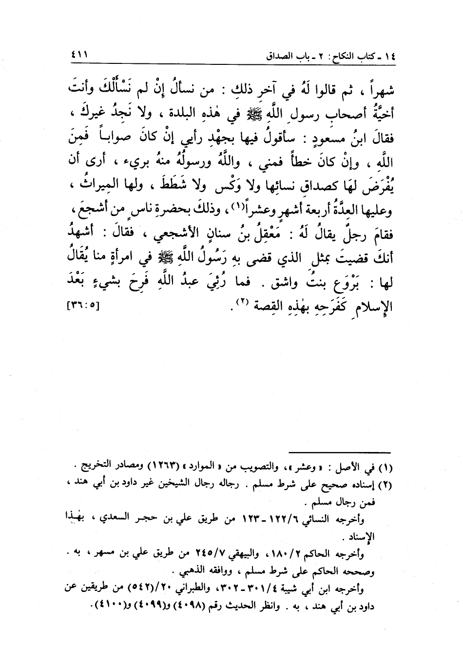 شَهْرًا، ثُمَّ قَالُوا لَهُ فِي آخِرِ ذَلِكَ: مَنْ نَسْأَلُ إِنْ لَمْ نَسْأَلْكَ وَأَنْتَ أُخَيَّةُ أَصْحَابِ رَسُولِ اللَّهِ صَلَّى اللَّهُ عَلَيْهِ وَسَلَّمَ فِي هَذِهِ الْبَلْدَةِ، وَلَا نَجْدُ غَيْرَكَ، فَقَالَ بن مسعود: سأقول فيها بجهد رأي إِنْ كَانَ صَوَابًا فَمِنَ اللَّهِ، وَإِنْ كَانَ خَطَأً فَمِنِّي، وَاللَّهُ وَرَسُولُهُ مِنْهُ بَرِيءٌ، أَرَى أَنْ يُفْرَضَ لَهَا كَصَدَاقِ نِسَائِهَا وَلَا وَكْسَ وَلَا شَطَطَ، وَلَهَا الْمِيرَاثُ، وَعَلَيْهَا الْعِدَّةُ أَرْبَعَةَ أَشْهُرٍ وَعَشْرًا1، وَذَلِكَ بِحَضْرَةِ نَاسٍ مِنْ أَشْجَعَ، فَقَامَ رَجُلٌ يُقَالُ لَهُ: مَعْقِلُ بْنُ سِنَانٍ الْأَشْجَعِيُّ، فَقَالَ: أَشْهَدُ أَنَّكَ قَضَيْتَ بِمِثْلِ الَّذِي قَضَى بِهِ رَسُولُ اللَّهِ صَلَّى اللَّهُ عَلَيْهِ وَسَلَّمَ فِي امْرَأَةٍ مِنَّا يُقَالُ لَهَا: بِرْوَعُ بِنْتُ وَاشِقٍ. فَمَا رُئِيَ عَبْدُ اللَّهِ فَرِحَ بشيء بعد الإسلام كفرحه بهذه القصة2. [36:5]