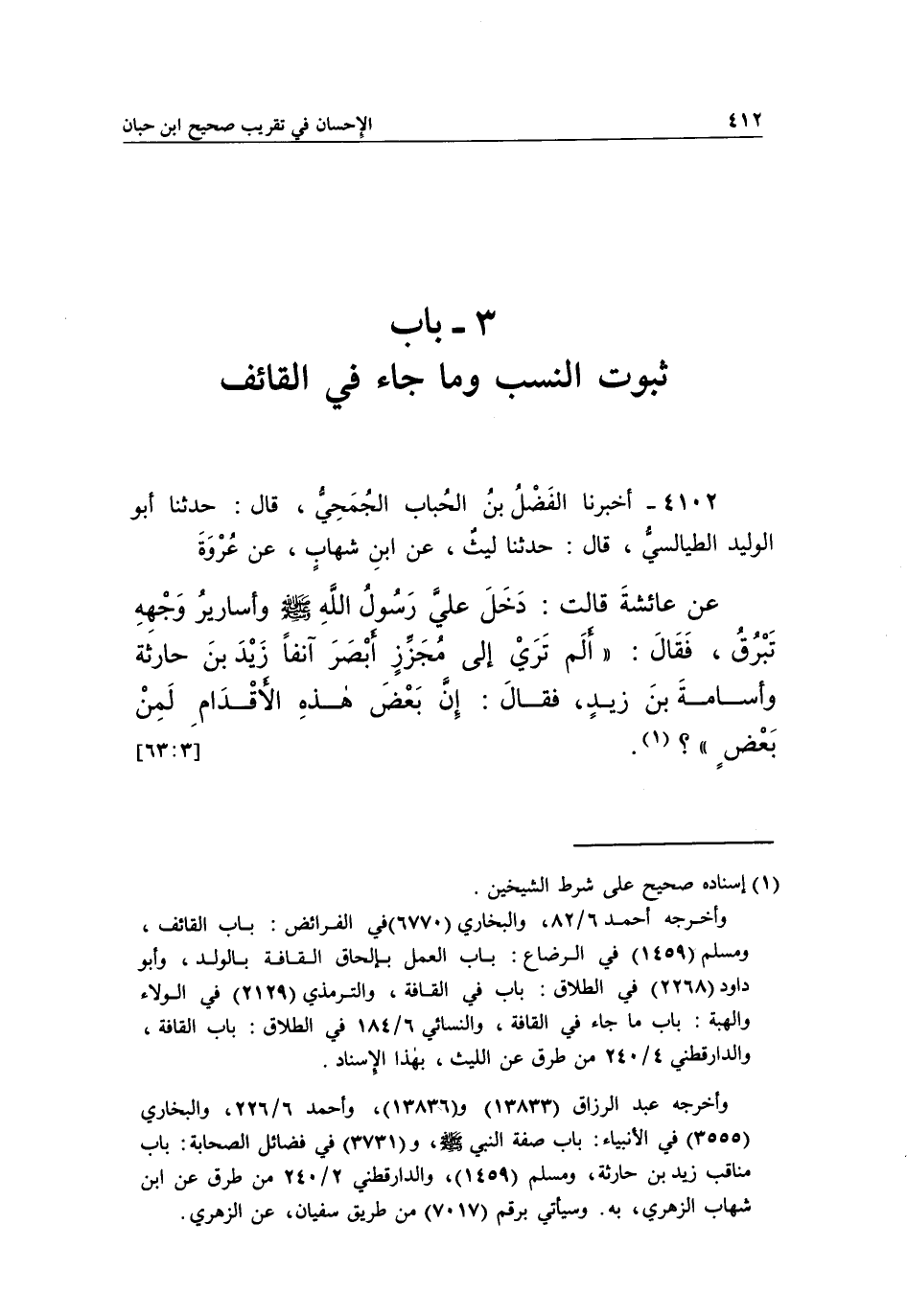 4102 - أَخْبَرَنَا الْفَضْلُ بْنُ الْحُبَابِ الْجُمَحِيُّ، قَالَ: حَدَّثَنَا أَبُو الْوَلِيدِ الطَّيَالِسِيُّ، قَالَ: حَدَّثَنَا لَيْثٌ، عَنِ بن شِهَابٍ، عَنْ عُرْوَةَ، عَنْ عَائِشَةَ قَالَتْ: دَخَلَ عَلَيَّ رَسُولُ اللَّهِ صَلَّى اللَّهُ عَلَيْهِ وسلم وَأَسَارِيرُ وَجْهِهِ تَبْرُقُ، فَقَالَ: "أَلَمْ تَرَيْ إِلَى مُجَزِّزٍ أَبْصَرَ آنِفًا زَيْدَ بْنَ حَارِثَةَ وَأُسَامَةَ بْنَ زَيْدٍ، فَقَالَ: إِنَّ بَعْضَ هَذِهِ الْأَقْدَامِ لمن بعض"؟ 1. [63:3]