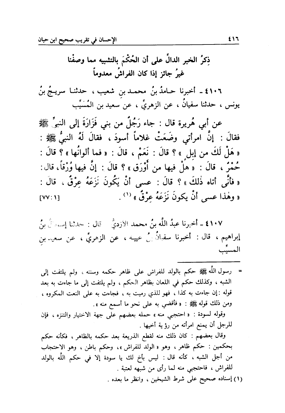 4106 - أَخْبَرَنَا حَامِدُ بْنُ مُحَمَّدِ بْنِ شُعَيْبٍ، حَدَّثَنَا سُرَيْجُ بْنُ يُونُسَ، حَدَّثَنَا سُفْيَانُ، عَنِ الزُّهْرِيِّ، عَنْ سَعِيدِ بْنِ الْمُسَيِّبِ، عَنْ أَبِي هُرَيْرَةَ قَالَ: جَاءَ رَجُلٌ مِنْ بَنِي فَزَارَةَ إِلَى النَّبِيِّ صَلَّى اللَّهُ عَلَيْهِ وَسَلَّمَ فَقَالَ: "إِنَّ امْرَأَتِي وَضَعَتْ غُلَامًا أَسْوَدَ"، فَقَالَ لَهُ النَّبِيُّ صَلَّى اللَّهُ عَلَيْهِ وَسَلَّمَ: "هَلْ لَكَ مِنْ إِبِلٍ"؟ قَالَ: نَعَمْ. قَالَ: "فَمَا أَلْوَانُهَا"؟ قَالَ: حُمْرٌ. قَالَ: "هَلْ فِيهَا مِنْ أَوْرَقَ"؟ قَالَ: إِنَّ فِيهَا وُرْقًا، قَالَ: "فَأَنَّى أَتَاهُ ذَلِكَ"؟ قَالَ: عَسَى أَنْ يَكُونَ نَزَعَهُ عِرْقٌ، قَالَ: "وَهَذَا عَسَى أَنْ يَكُونَ نَزَعَهُ عِرْقٌ" 1. [77:1]