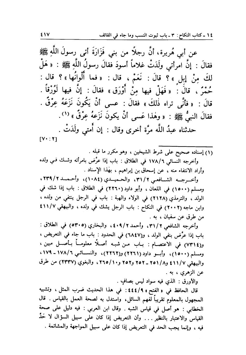 وأخرجه الشافعي 2/31، وأحمد 2/409، والبخاري 5303 في الطلاق: باب إذا عرض بنفي الولد، و 6847 في الحدود: باب ما جاء في التعريض، و7314 في الاعتصام: باب من شبه أصلاً معلوماً بأصل مبين، ومسلم 1500، وأبو داود 2261 2262، والنسائي6/178-179، والبيهقي 7/411 و8/251-252 و 252 و 10/265، والبغوي 2337 من طرق عن الزه9ري، به.