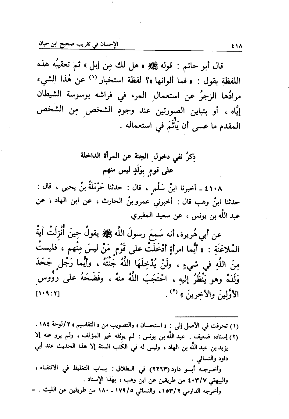 4108 - أخبرنا بْنِ سَلْمٍ، قَالَ: حَدَّثَنَا حَرْمَلَةُ بْنُ يَحْيَى، قَالَ: حَدَّثَنَا بن وَهْبٍ، قَالَ: أَخْبَرَنِي عَمْرُو بْنُ الْحَارِثِ، عَنْ بن الْهَادِ، عَنْ عَبْدِ اللَّهِ بْنِ يُونُسَ، عَنْ سَعِيدٍ الْمَقْبُرِيِّ، عَنْ أَبِي هُرَيْرَةَ إِنَّهُ سَمِعَ رَسُولَ اللَّهِ صَلَّى اللَّهُ عَلَيْهِ وَسَلَّمَ يقول حِينَ أُنْزِلَتْ آيَةُ الْمُلَاعَنَةِ: "أَيُّمَا امْرَأَةٍ أَدْخَلَتْ عَلَى قَوْمٍ مَنْ لَيْسَ مِنْهُمْ، فَلَيْسَتْ مِنَ اللَّهِ فِي شَيْءٍ، وَلَنْ يُدْخِلَهَا اللَّهُ جَنَّتَهُ، وَأَيُّمَا رَجُلٍ جَحَدَ وَلَدَهُ وَهُوَ يَنْظُرُ إِلَيْهِ، احتجب الله منه، وفضحه على رؤوس الأولين والآخرين" 1. [109:2]