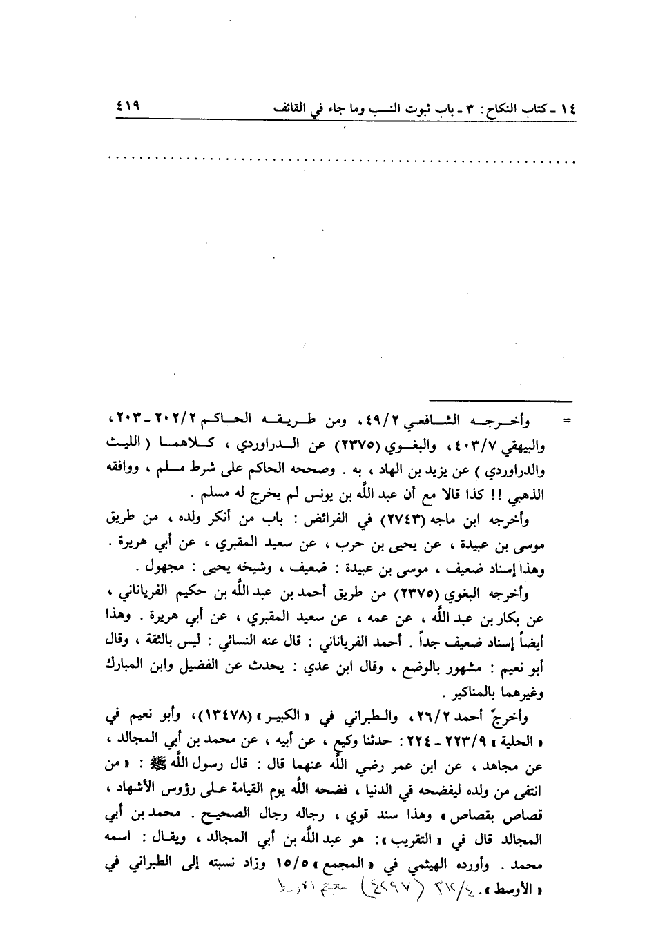 وأخرج أحمد 2/26، والطبراني في الكبير 13478، وأبو نعيم في الحلية9/223-224: حدثنا وكيع، عن أبيه، عن محمد ابن ابي المجالد، عن مجاهد، عن ابن عمر رضي الله عنهما قال قال رسول الله صلى الله عليه وسلم: "من انتفى من ولده ليفضحه في الدنيا، فضحه الله يوم القيامة على رؤوس الأشهاد، قصاص بقصاص" وهذا سند قوي، رجاله رجال الصحيح. محمد بن أبي المجالد قال في التقريب: هو عبد الله بن أبي المجالد، ويقال اسمه محمد. وأورده الهيثمي في المجمع5/15 وزاد نسبته إلى الطبراني في الأوسط.