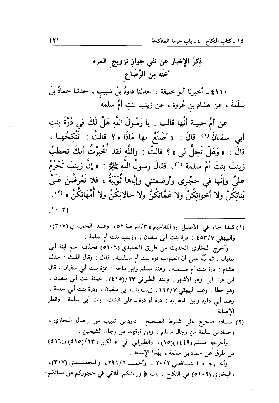 4110 - أَخْبَرَنَا أَبُو خَلِيفَةَ، حَدَّثَنَا أبو دَاوُدُ بْنُ شَبِيبٍ، حَدَّثَنَا حَمَّادُ بْنُ سَلَمَةَ، عَنْ هِشَامِ بْنِ عُرْوَةَ، عَنْ زَيْنَبَ بِنْتِ أُمِّ سَلَمَةَ، عَنْ أُمِّ حَبِيبَةَ أَنَّهَا قَالَتْ: يَا رَسُولَ اللَّهِ هَلْ لَكَ فِي دُرَّةَ بِنْتِ أَبِي سُفْيَانَ1 قَالَ: "أَصْنَعُ بِهَا مَاذَا"؟ قَالَتْ: تَنْكِحُهَا، قَالَ: "وَهَلْ تَحِلُّ لِي". قَالَتْ: وَاللَّهِ لَقَدْ أُخْبِرْتُ أَنَّكَ تَخْطِبُ زَيْنَبَ بِنْتَ أُمِّ سَلَمَةَ، فَقَالَ رَسُولُ اللَّهِ صَلَّى اللَّهُ عَلَيْهِ وَسَلَّمَ: "إِنَّ زَيْنَبَ تَحْرُمُ عَلَيَّ وَإِنَّهَا فِي حِجْرِي وَأَرْضَعَتْنِي وَإِيَّاهَا ثُوَيْبَةُ، فَلَا تَعْرِضْنَ عَلَيَّ بَنَاتِكُنَّ وَلَا أَخَوَاتِكُنَّ وَلَا عَمَّاتِكُنَّ وَلَا خالاتكن ولا أمهاتكن" 2. [10:3]