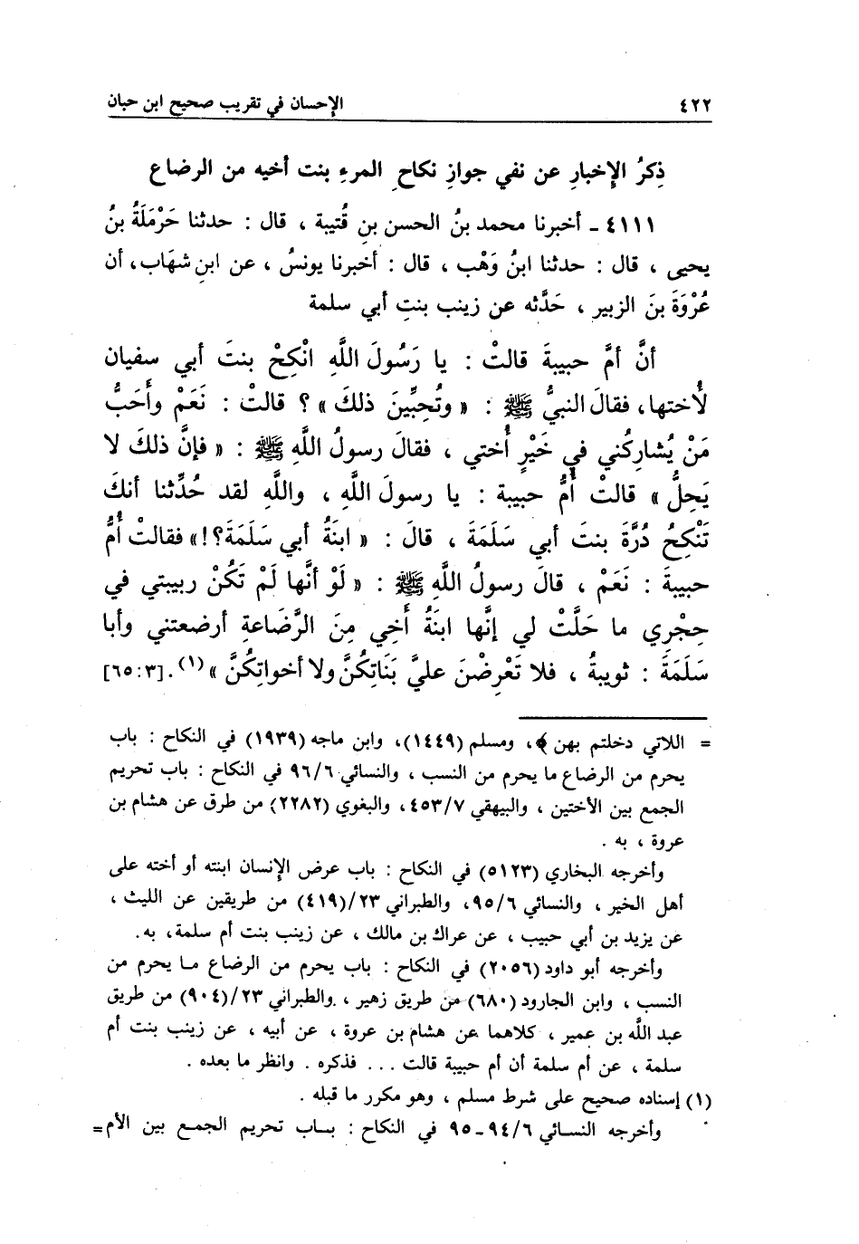 4111 - أَخْبَرَنَا مُحَمَّدُ بْنُ الْحَسَنِ بْنِ قُتَيْبَةَ، قَالَ: حَدَّثَنَا حَرْمَلَةُ بْنُ يَحْيَى، قَالَ: حَدَّثَنَا بن وهب، قال: أخبرنا يونس، عن بن شِهَابٍ أَنَّ عُرْوَةَ بْنَ الزُّبَيْرِ، حَدَّثَهُ عَنْ زَيْنَبَ بِنْتِ أَبِي سَلَمَةَ، أَنَّ أُمَّ حَبِيبَةَ قَالَتْ: يَا رَسُولَ اللَّهِ انْكِحْ بِنْتَ أَبِي سُفْيَانَ لِأُخْتِهَا، فَقَالَ النَّبِيُّ صَلَّى اللَّهُ عَلَيْهِ وسلم: "وتحبين ذلك"؟ قالت: نعم أحب مَنْ يُشَارِكُنِي فِي خَيْرٍ أُخْتِي، فَقَالَ رَسُولُ اللَّهِ صَلَّى اللَّهُ عَلَيْهِ وَسَلَّمَ: "فَإِنَّ ذَلِكَ لَا يَحِلُّ"، قَالَتْ أُمُّ حَبِيبَةَ: يَا رَسُولَ اللَّهِ، وَاللَّهِ لَقَدْ حُدِّثْنَا أَنَّكَ تُنْكِحُ دُرَّةَ بِنْتَ أَبِي سَلَمَةَ، قَالَ: "ابْنَةُ أَبِي سَلَمَةَ؟! " فَقَالَتْ أُمُّ حَبِيبَةَ: نَعَمْ، قَالَ رَسُولُ اللَّهِ صَلَّى اللَّهُ عَلَيْهِ وَسَلَّمَ: "لَوْ أَنَّهَا لَمْ تَكُنْ رَبِيبَتِي فِي حِجْرِي مَا حَلَّتْ لِي إِنَّهَا ابْنَةُ أَخِي مِنَ الرَّضَاعَةَ أَرْضَعَتْنِي وَأَبَا سَلَمَةَ: ثُوَيْبَةُ، فَلَا تَعْرِضْنَ عَلَيَّ بَنَاتِكُنَّ وَلَا أخواتكن" 1. [65:3]
