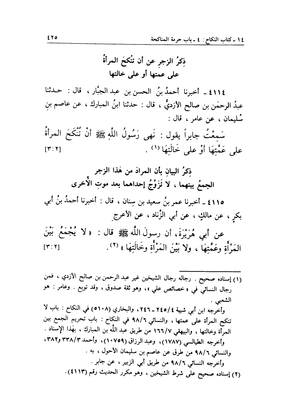 4114 - أَخْبَرَنَا أَحْمَدُ بْنُ الْحَسَنِ بْنِ عَبْدِ الْجَبَّارِ، قَالَ: حَدَّثَنَا عَبْدُ الرَّحْمَنِ بْنُ صَالِحٍ الْأَزْدِيُّ، قال: حدثنا بن الْمُبَارَكِ، عَنْ عَاصِمِ بْنِ سُلَيْمَانَ، عَنْ عَامِرٍ، قال: سمعت جابر يَقُولُ: نَهَى رَسُولُ اللَّهِ صَلَّى اللَّهُ عَلَيْهِ وَسَلَّمَ أَنْ تُنْكَحَ الْمَرْأَةُ عَلَى عَمَّتِهَا أَوْ على خالتها1. [3:2]