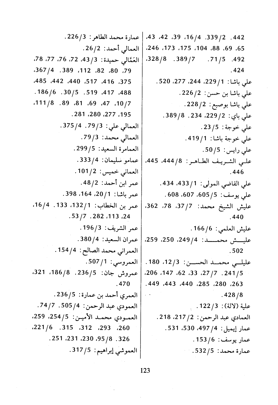 العمالي حميدة: 3/ 43، 72، 76، 77، 78، 79، 80، 82، 112، 389، 4/ 367، 375، 416، 517، 440، 442، 485، 488، 417، 519، 5/ 30، 6/ 186، 7/ 10، 47، 69، 81، 89، 8/ 111، 195، 277، 280، 281،