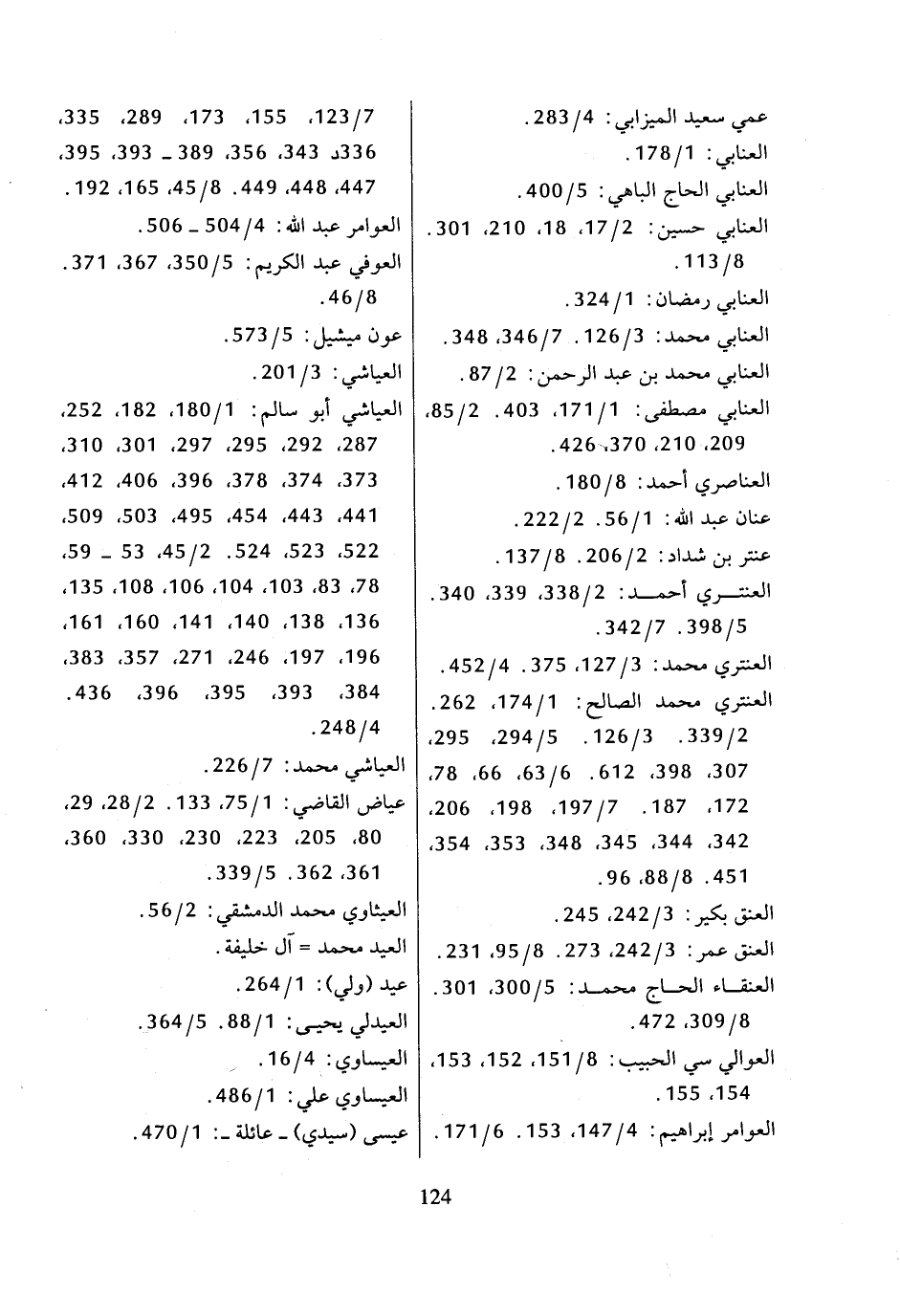العنتري محمد الصالح: 1/ 174، 262، 2/ 339، 3/ 126، 5/ 294، 295، 307, 398, 612، 6/ 63، 66، 78، 172, 187، 7/ 197، 198، 206، 342, 344, 345, 348, 353, 354، 451، 8/ 88، 96،