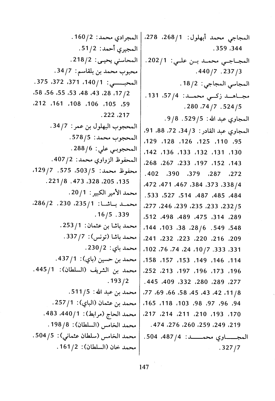 المجاوي عبد القادر: 3/ 34، 72، 88، 91، 95، 110، 125، 126، 128، 129، 130، 131، 132، 133، 136، 142، 143، 152، 197، 233، 267، 268، 272، 287، 379، 390، 402، 4/ 338، 373، 384، 467، 471، 472، 484، 485، 487، 514، 527، 533، 5/ 232، 233، 235، 239، 246، 277، 289، 314، 475، 489، 498، 512، 48، 549، 6/ 28، 38، 103، 144،