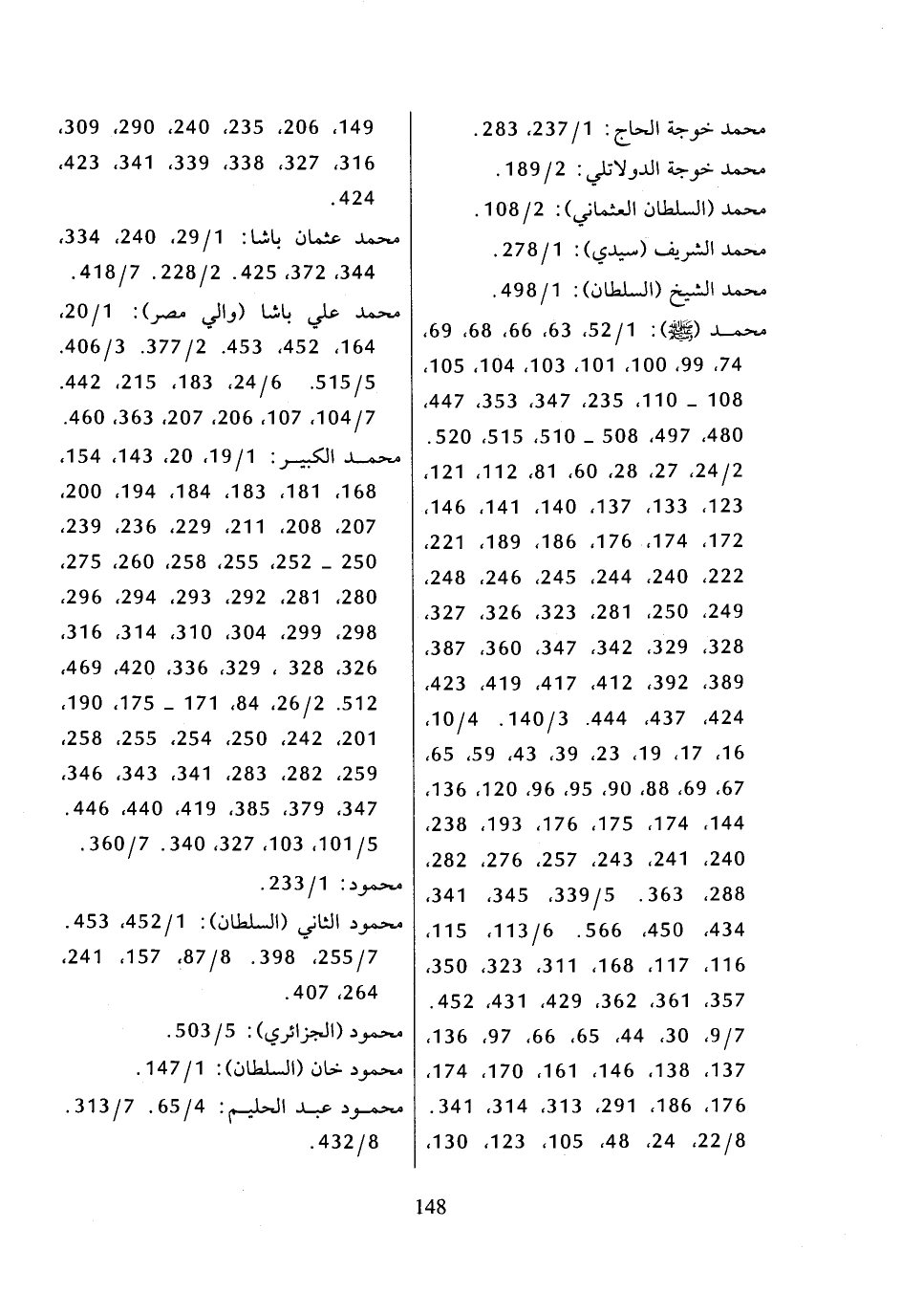 محمد الكبير: 1/ 19، 20، 143، 154، 168، 181، 183، 184، 194، 200، 207، 208، 211، 229، 236، 239، 250 - 252، 255، 258، 260، 275، 280، 281، 292، 293، 294، 296، 298، 299، 304، 310، 314، 316، 326، 328، 329، 336، 420، 469، 512، 2/ 26، 84، 171 - 175، 190، 201، 242، 250، 254، 255، 258، 259، 282، 283، 341، 343، 346، 347، 379، 385، 419، 440، 446، 5/ 101، 103، 327، 340، 7/ 360،