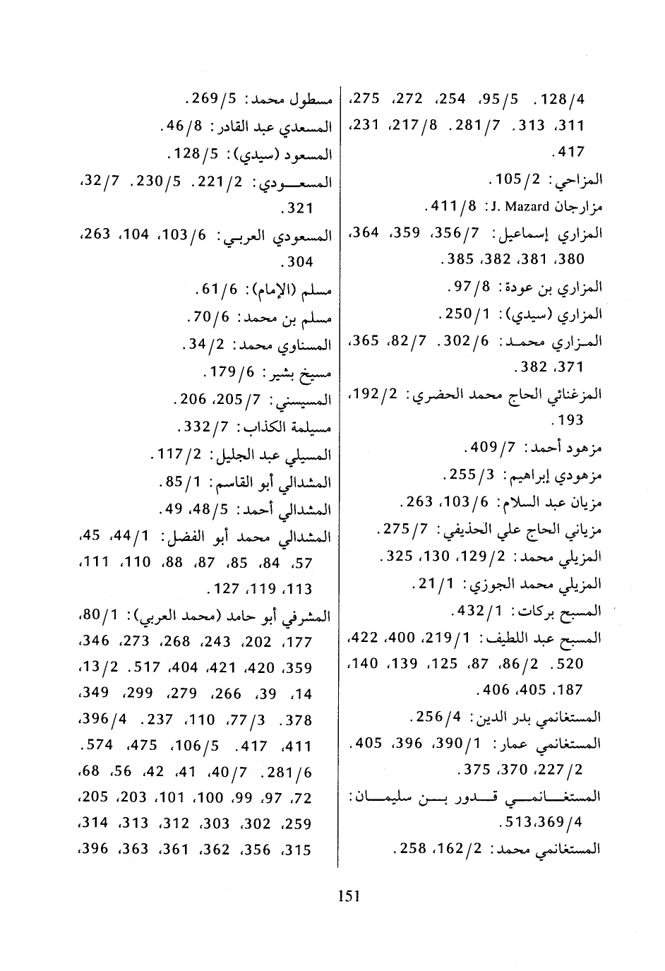 المشرفي أبو حامد (محمد العربي): 1/ 80، 177، 202، 243، 268، 273، 346، 359، 420، 421، 404، 517، 2/ 13، 14، 39، 266، 279، 299، 349، 378، 3/ 77، 110، 237، 4/ 396، 411، 417، 5/ 106، 475، 574، 6/ 281، 7/ 40، 41، 42، 56، 68، 72، 97، 99، 100، 101، 203، 205، 259، 302، 303، 312، 313، 314، 315، 356، 362، 361، 363، 396،