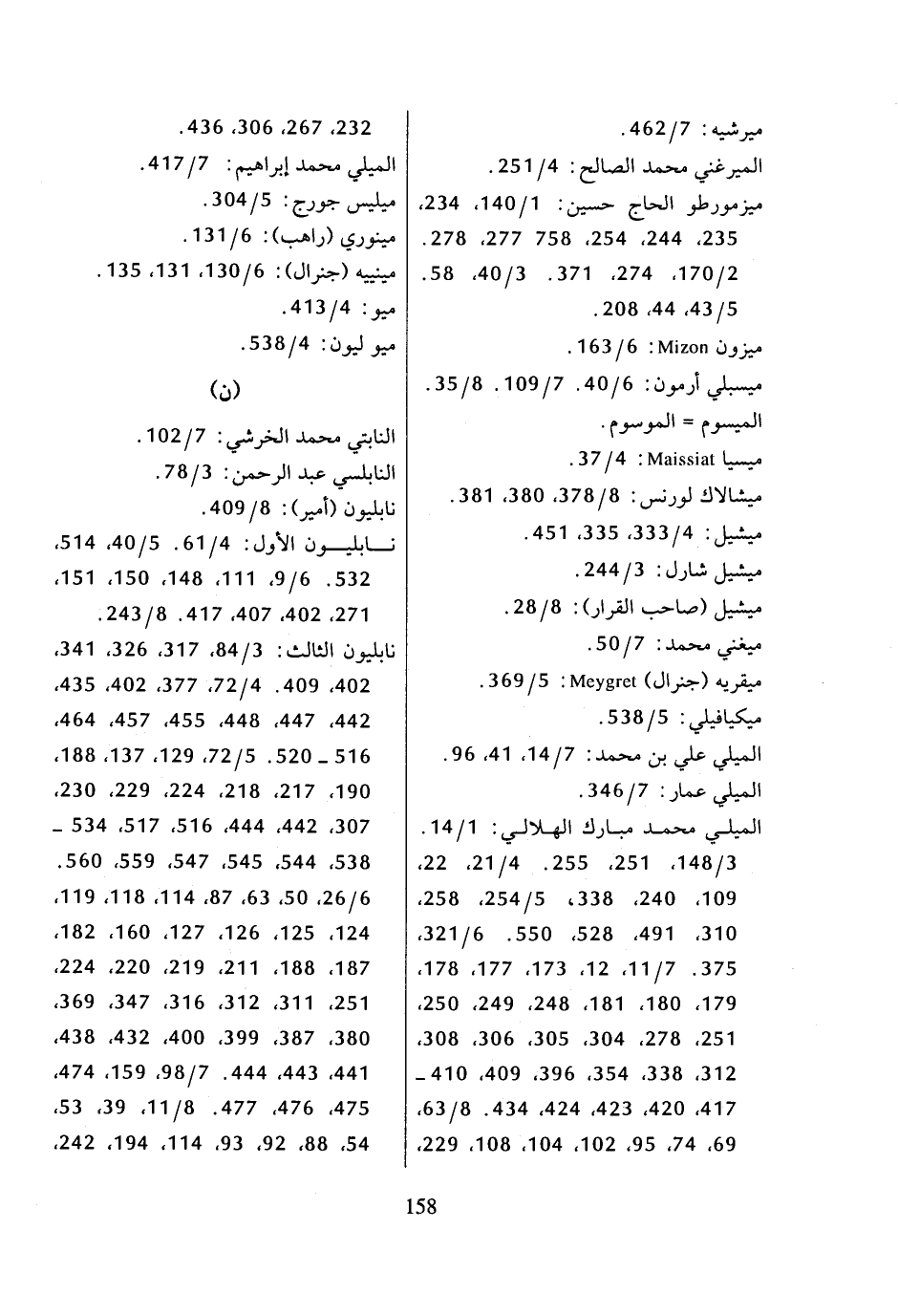 الميلي محمد مبارك الهلالي: 1/ 14، 3/ 148، 251، 255، 4/ 21، 22، 109، 240، 338، 5/ 254، 258، 310، 491، 528، 550، 6/ 321، 375، 7/ 11، 12، 173، 177، 178، 179، 180، 181، 248، 249، 250، 251، 278، 304، 305، 306، 308، 312، 338، 354، 396، 409، 410 - 417، 420، 423، 424، 434، 8/ 63، 69، 74، 95، 102، 104، 108، 229، 232، 267، 306، 436،