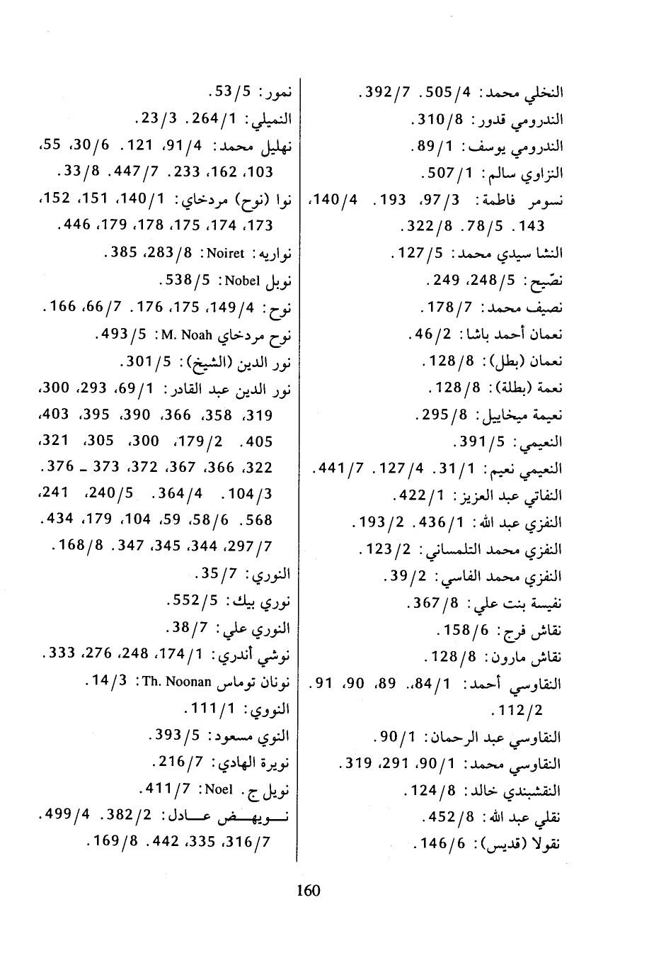 نور الدين عبد القادر: 1/ 69، 293، 300، 319، 358، 366، 390، 395، 403، 405، 2/ 179، 300، 305، 321، 322، 366، 367، 372، 373 - 376، 3/ 104، 4/ 364، 5/ 240، 241، 568، 6/ 58، 59، 104، 179، 434، 7/ 297، 344، 345، 347، 8/ 168،