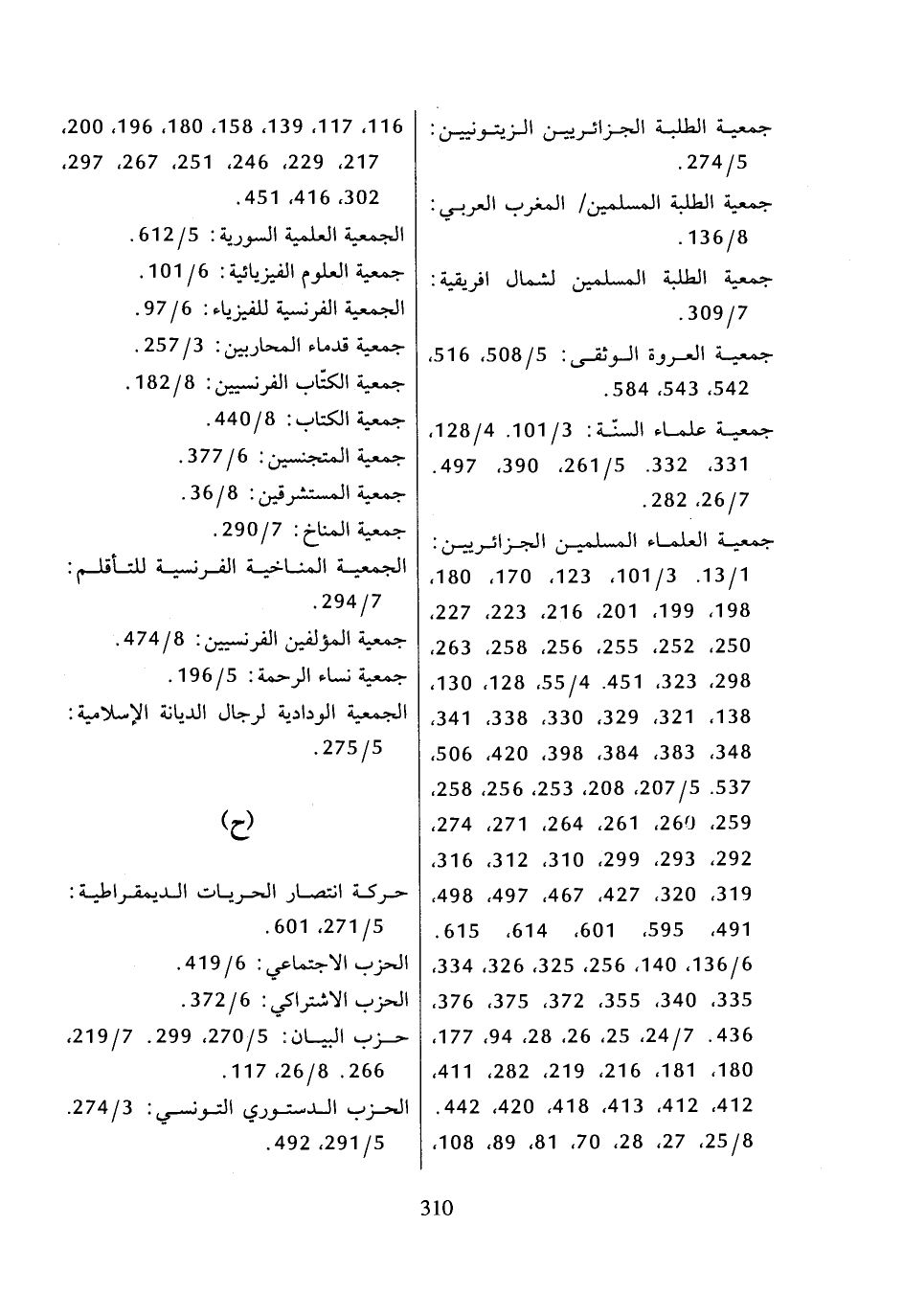 جمعية العلماء المسلمين الجزائريين: 1/ 13، 3/ 101، 123، 170، 180، 198، 199، 201، 216، 223، 227، 250، 252، 255، 256، 258، 263، 298، 323، 451، 4/ 55، 128، 130، 138، 321، 329، 330، 338، 341، 348، 383، 384، 398، 420، 506، 537، 5/ 207، 208، 253، 256، 258، 259، 260، 261، 264، 271، 274، 292، 293، 299، 310، 312، 316، 319، 320، 427، 467، 497، 498، 491، 595، 601، 614، 615، 6/ 136، 140، 256، 325، 326، 334، 335، 340، 355، 372، 375، 376، 436، 7/ 24، 25، 26، 28، 94، 177، 180، 181، 216، 219، 282، 411، 412، 412، 413، 418، 420، 442، 8/ 25، 27، 28، 70، 81، 89، 108، 217، 229، 246، 251، 267، 297، 302، 416، 451،