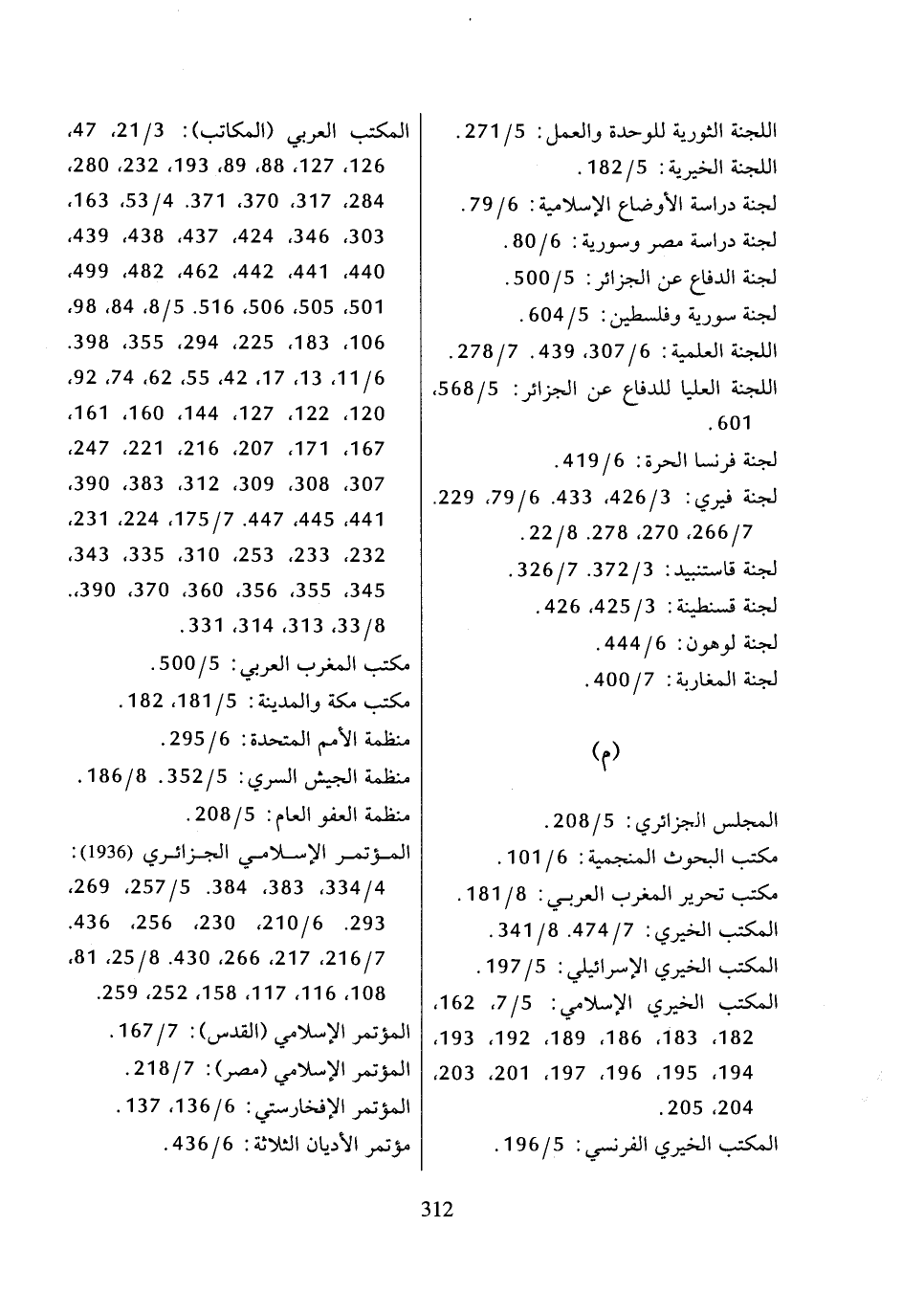 المؤتمر الإسلامي الجزائري (1936): 4/ 334، 383، 384، 5/ 257، 269، 293، 6/ 210، 230، 256، 436، 7/ 216، 217، 266، 430، 8/ 25، 81، 108، 116، 117، 158، 252، 259،