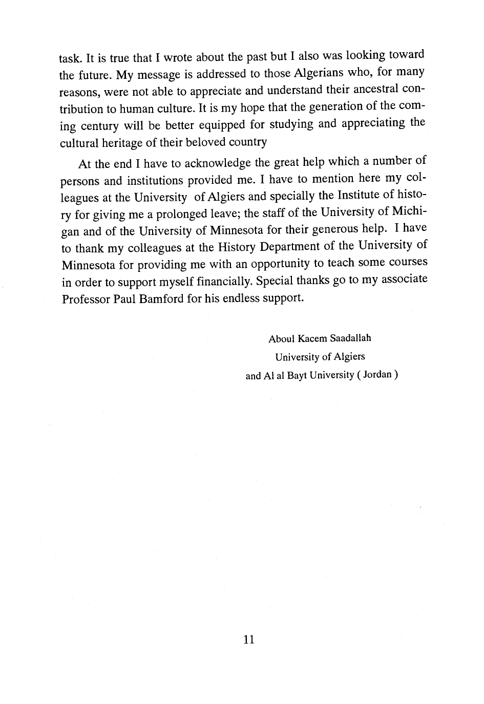 At the end I have to acknowledge the great help which a number of persons and institutions provided me. I have to mention here my colleagues at the University of Algiers and specially the Institute of history for giving me a prolonged leave; the staff of the University of Michigan and of the University of Minnesota for their generous help. I have to thank my colleagues at the History Department of the University of Minnesota for providing me with an opportunity to teach some courses in order to support myself financially. Special thanks go to my associate Professor Paul Bamford for his endless support.