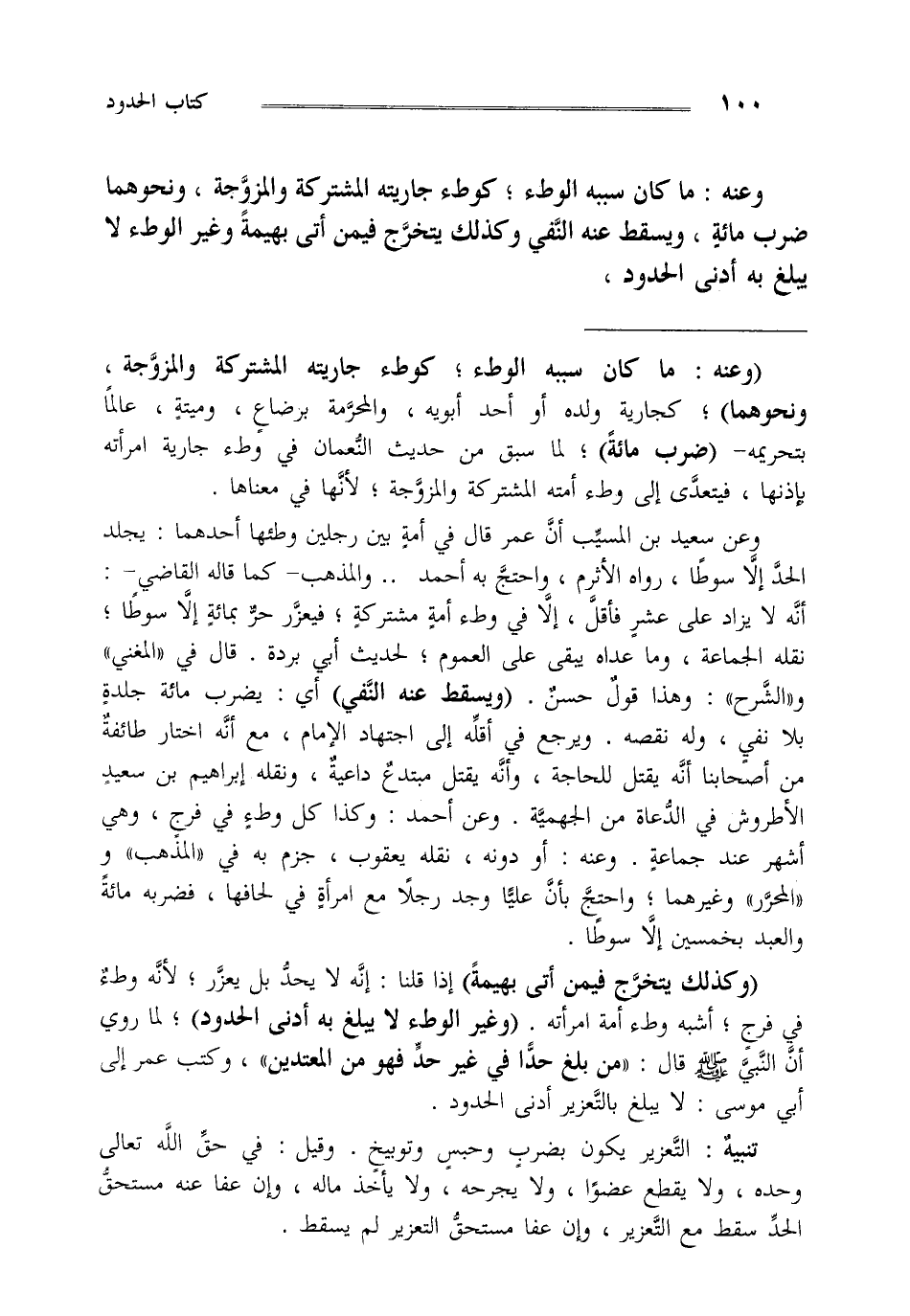وعنه ما كان سببه الوطء كوطء جاريته المشتركة والمزوجة ونحوهما ضرب مائة ويسقط عنه النفي وكذلك يتخرج فيمن أتى بهيمة وغير الوطء لا يبلغ به أدنى الحدود.