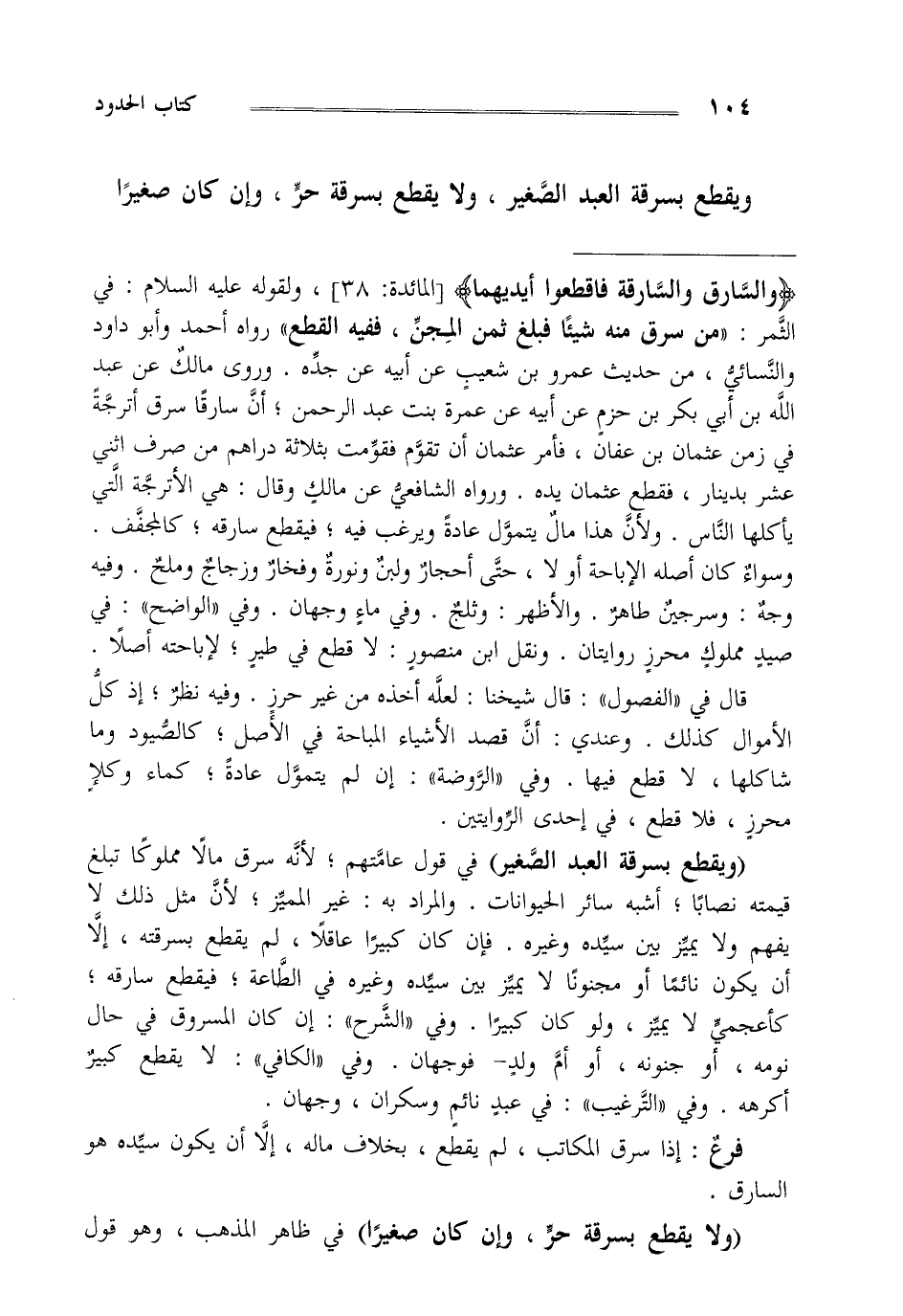 "ويقطع بسرقة العبد الصغير" في قول عامتهم لأنه سرق مالا مملوكا تبلغ أشبه سائر الحيوانات والمراد به غير المميز لأن مثل ذلك لا يفهم ولا يميز بين سيده وغيره فإن كان كبيرا عاقلا لم يقطع بسرقته إلا أن يكون نائما أو مجنونا لا يميز بين سيده وغيره في الطاعة فيقطع سارقه كأعجمي لا يميز ولو كان كبيرا وفي الشرح إن كان المسروق في حال نومه أو جنونه أو أم ولد فوجهان وفي الكافي لا يقطع كبير أكرهه وفي الترغيب في عبد نائم وسكران وجهان.