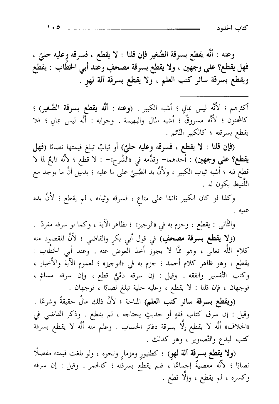 وعنه أنه يقطع بسرقة الصغير فإن قلنا لا يقطع فسرقه وعليه حلي فهل يقطع على وجهين ولا يقطع بسرقة مصحف وعند أبي الخطاب يقطع ويقطع بسرقة سائر كتب العلم ولا يقطع بسرقة آلة لهو