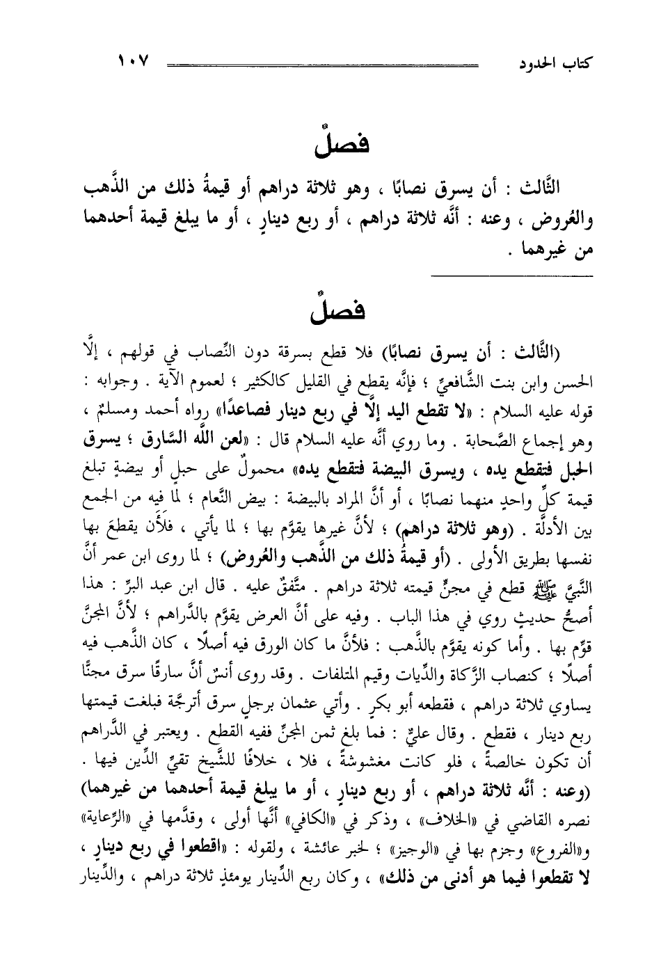 "الثالث: أن يسرق نصابا" فلا قطع بسرقة دون النصاب في قولهم إلا الحسن وابن بنت الشافعي فإنه يقطع في القليل كالكثير لعموم الآية وجوابه قوله عليه السلام "لا تقطع اليد إلا في ربع دينار فصاعدا" رواه أحمد ومسلم وهو إجماع الصحابة وما روي أنه عليه السلام قال "لعن الله السارق يسرق الحبل فتقطع يده ويسرق البيضة فتقطع يده" محمول على حبل أو بيضة تبلغ قيمة كل واحد منهما نصابا أو أن المراد بالبيضة بيض النعام لما فيه من الجمع بين الأدلة "وهو ثلاثة دراهم" لأن غيرها يقوم بها لما يأتي فلأن يقطع بها نفسها بطريق الأولى "أو قيمة ذلك من الذهب والعروض" لما روى ابن عمر "أن النبي صلى الله عليه وسلم قطع في مجن قيمته ثلاثة دراهم" متفق عليه قال ابن عبد البر هذا أصح حديث روي في هذا الباب وفيه على أن العرض يقوم بالدراهم لأن المجن قوم بها وأما كونه يقوم بالذهب فلأن ما كان الورق فيه أصلا كان الذهب فيه أصلا كنصاب الزكاة والديات وقيم المتلفات وقد روى أنس "أن سارقا سرق مجنا يساوي ثلاثة دراهم فقطعه أبو بكر" وأتي عثمان برجل سرق أترجة فبلغت قيمتها ربع دينار فقطع وقال علي "فما بلغ ثمن المجن ففيه القطع" ويعتبر في الدراهم أن تكون خالصة فلو كانت مغشوشة فلا خلافا للشيخ تقي الدين فيها "وعنه أنه ثلاثة دراهم أو ربع دينار أو ما يبلغ قيمة أحدهما من غيرهما" نصره القاضي في الخلاف وذكر في الكافي أنها أولى وقدمها في الرعاية والفروع وجزم بها في الوجيز لخبر عائشة ولقوله "اقطعوا في ربع دينار لا تقطعوا فيما هو أدنى من ذلك" وكان ربع الدينار يومئذ ثلاثة دراهم والدينار