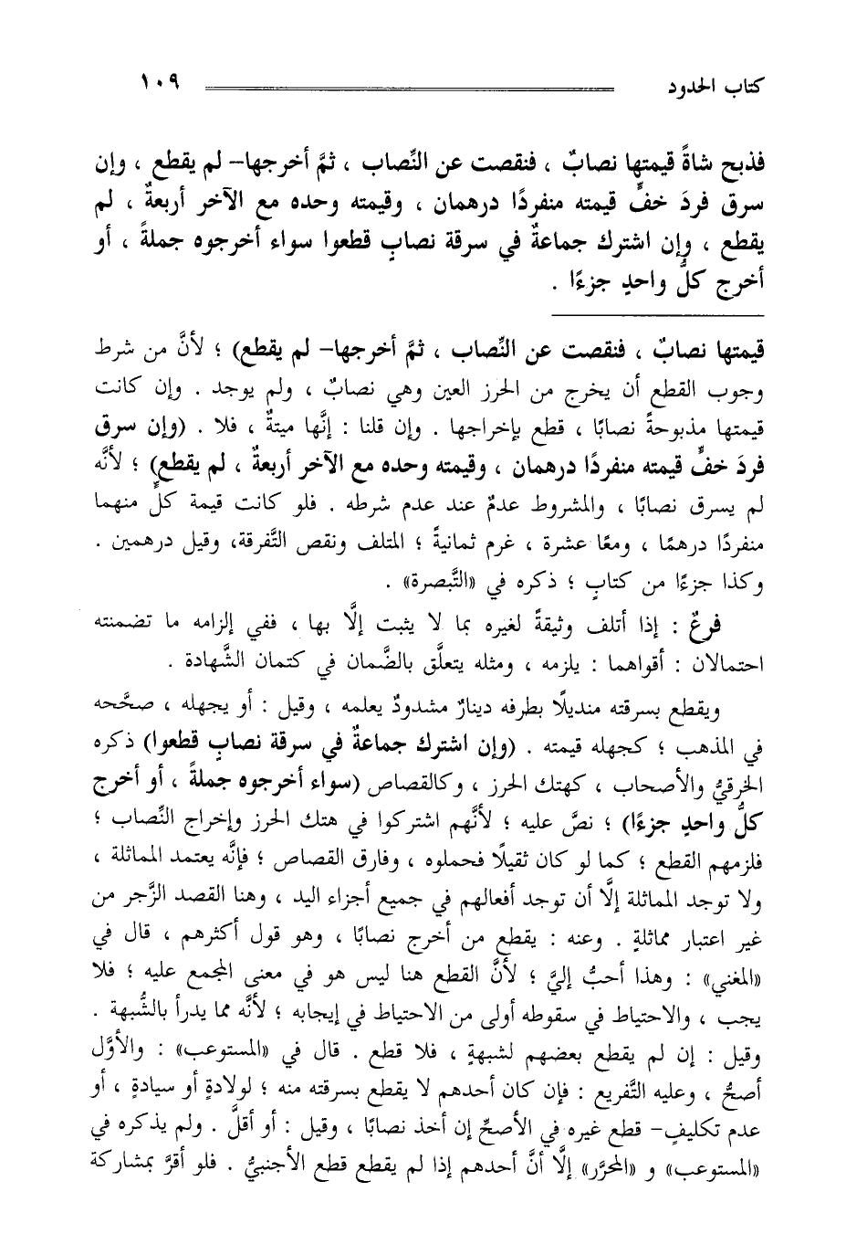 قيمتها نصاب فنقصت عن النصاب ثم أخرجها لم يقطع" لأن من شرط وجوب القطع أن يخرج من الحرز العين وهي نصاب ولم يوجد وإن كانت قيمتها مذبوحة نصابا قطع بإخراجها وإن قلنا إنها ميتة فلا "وإن سرق فرد خف قيمته منفردا درهمان وقيمته وحده مع الآخر أربعة لم يقطع" لأنه لم يسرق نصابا والمشروط عدم عند عدم شرطه فلو كانت قيمة كل منهما منفردا درهما و معا عشرة غرم ثمانية المتلف ونقص التفرقة وقيل درهمين وكذا جزءا من كتاب ذكره في التبصرة.