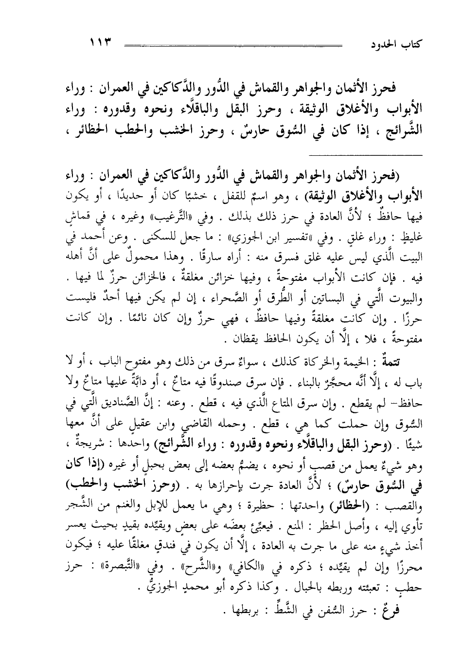 "فحرز الأثمان والجواهر والقماش في الدور والدكاكين في العمران وراء الأبواب والأغلاق الوثيقة" وهو اسم للقفل خشبا كان أو حديدا أو يكون فيها حافظ لأن العادة في حرز ذلك بذلك وفي الترغيب وغيره في قماش غليظ وراء غلق وفي تفسير ابن الجوزي ما جعل للسكنى وعن أحمد في البيت الذي ليس عليه غلق فسرق منه أراه سارقا وهذا محمول على أن أهله فيه فإن كانت الأبواب مفتوحة وفيها خزائن مغلقة فالخزائن حرز لما فيها والبيوت التي في البساتين أو الطرق أو الصحراء إن لم يكن فيها أحد فليست حرزا وإن كانت مغلقة وفيها حافظ فهي حرز وإن كان نائما وإن كانت مفتوحة فلا إلا أن يكون الحافظ يقظان.