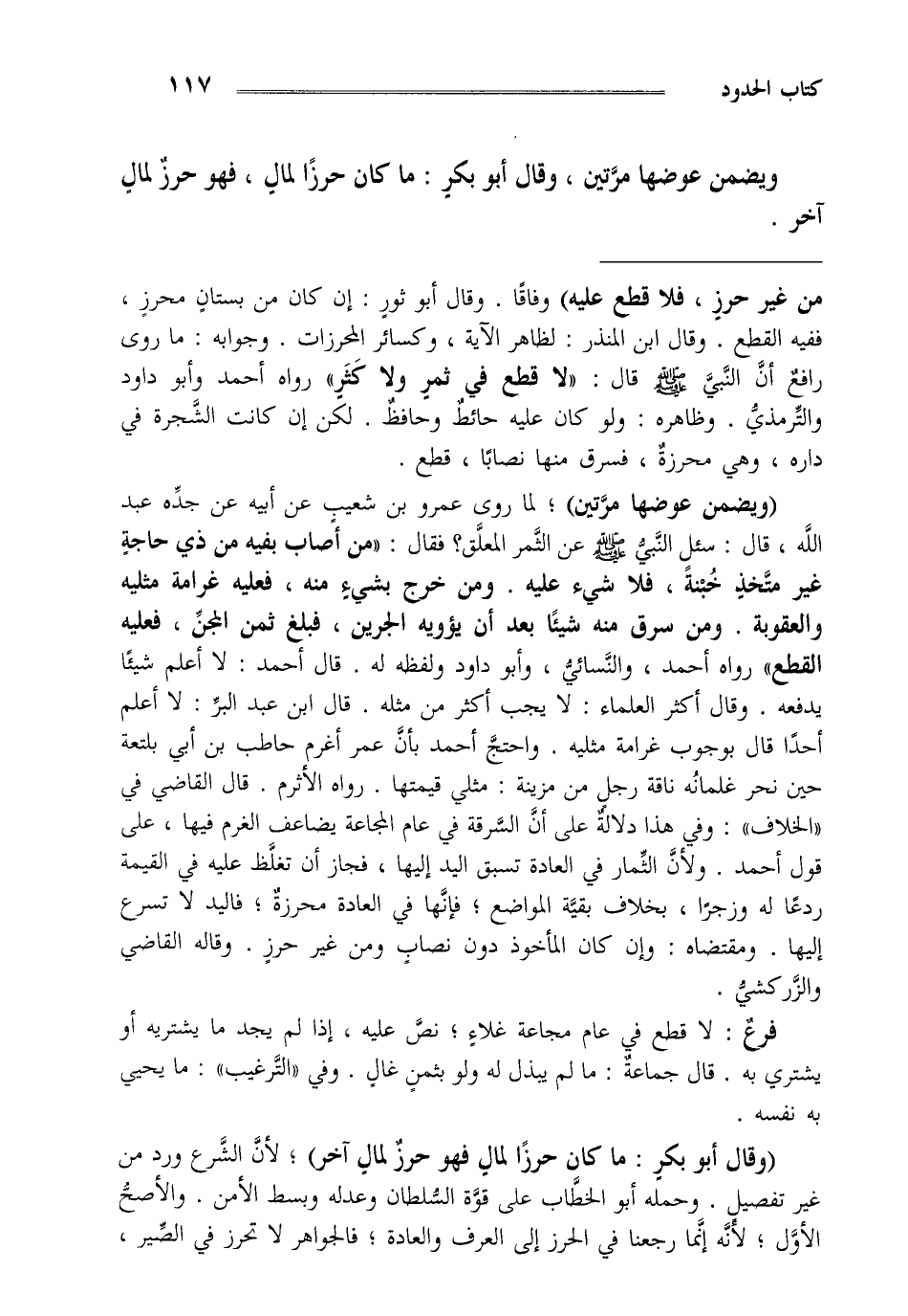 من غير حرز فلا قطع عليه" وفاقا وقال أبو ثور إن كان من بستان محرز ففيه القطع وقال ابن المنذر لظاهر الآية وكسائر المحرزات وجوابه ما روى رافع أن النبي صلى الله عليه وسلم قال "لا قطع في ثمر ولا كثر" رواه أحمد وأبو داود والترمذي وظاهره ولو كان عليه حائط وحافظ لكن إن كانت الشجرة في داره وهي محرزة فسرق منها نصابا قطع.