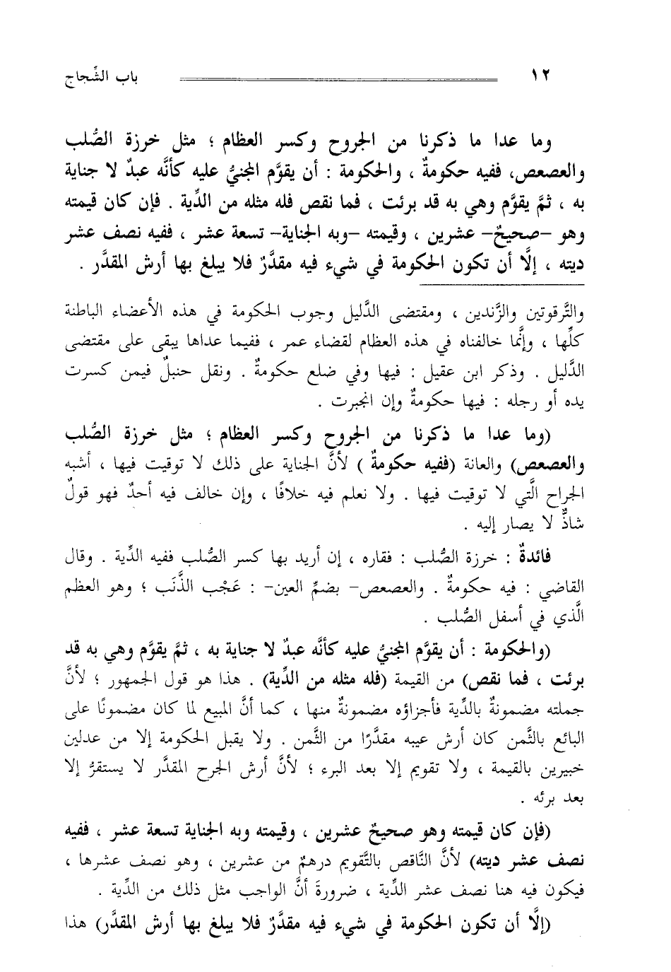 "والحكومة أن يقوم المجني عليه كأنه عبد لا جناية به ثم يقوم وهي به قد برئت فما نقص" من القيمة "فله مثله من الدية" هذا هو قول الجمهور لأن جملته مضمونة بالدية فأجزاؤه مضمونة منها كما أن المبيع لما كان مضمونا على البائع بالثمن كان أرش عيبه مقدرا من الثمن ولا يقبل الحكومة إلا من عدلين خبيرين بالقيمة ولا تقويم إلا بعد البرء لأن أرش الجرح المقدر لا يستقر إلا بعد برئه.