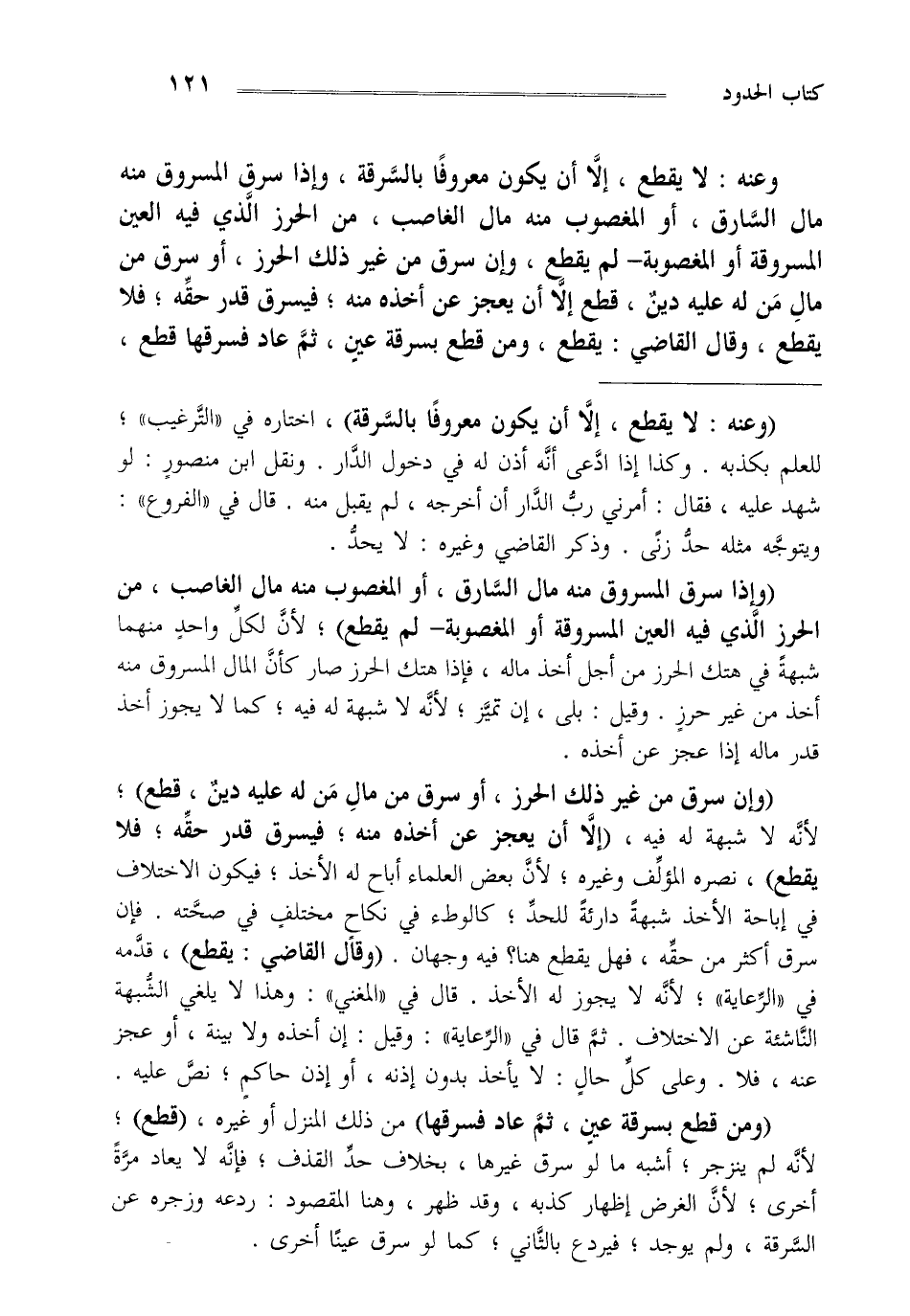 "وعنه لا يقطع إلا أن يكون معروفا بالسرقة" اختاره في الترغيب للعلم بكذبه وكذا إذا ادعى أنه أذن له في دخول الدار ونقل ابن منصور لو شهد عليه فقال أمرني رب الدار أن أخرجه لم يقبل منه قال في الفروع ويتوجه مثله حد زنى وذكر القاضي وغيره لا يحد.