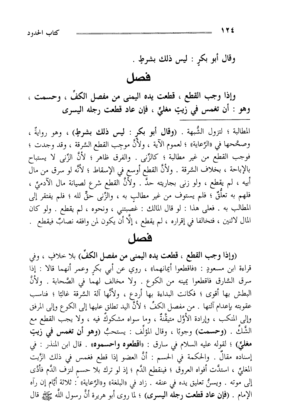 "وإذا وجب القطع قطعت يده اليمنى من مفصل الكف" بلا خلاف وفي قراءة ابن مسعود فاقطعوا أيمانهما روي عن أبي بكر وعمر أنهما قالا "إذا سرق السارق فاقطعوا يمينه من الكوع" ولا مخالف لهما في الصحابة ولأن البطش بها أقوى فكانت البداءة بها أردع ولأنها آلة السرقة غالبا فناسب عقوبته بإعدام آلتها من مفصل الكف لأن اليد تطلق عليها إلى الكوع و إلى المرفق و إلى المنكب وإرادة الأول متيقنة وما سواه مشكوك فيه ولا يجب القطع مع الشك "وحسمت" وجوبا وقال المؤلف يستحب وهو "أن تغمس في زيت" مغلي لقوله عليه السلام في سارق "اقطعوه واحسموه" قال ابن المنذر في إسناده مقال والحكمة في الحسم أن العضو إذا قطع فغمس في ذلك الزيت المغلي استدت أفواه العروق فينقطع الدم إذ لو ترك بلا حسم لنزف الدم فأدى إلى موته ويسن تعليق يده في عنقه زاد في البلغة والرعاية ثلاثة أيام إن رآه الإمام "فإن عاد قطعت رجله اليسرى" لما روى أبو هريرة أن رسول الله صلى الله عليه وسلم قال