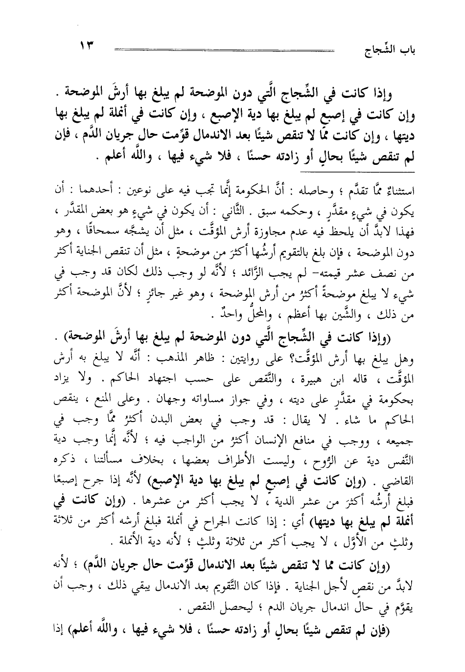 "وإذا كانت في الشجاج التي دون الموضحة لم يبلغ بها أرش الموضحة" وهل يبلغ بها أرش المؤقت على روايتين ظاهر المذهب أنه لا يبلغ به أرش المؤقت قاله ابن هبيرة والنقص على حسب اجتهاد الحاكم ولا يزاد بحكومة في مقدر على ديته وفي جواز مساواته وجهان وعلى المنع ينقص الحاكم ما شاء لا يقال قد وجب في بعض البدن أكثر مما وجب في جميعه ووجب في منافع الإنسان أكثر من الواجب فيه لأنه إنما وجب دية النفس دية عن الروح وليست الأطراف بعضها بخلاف مسألتنا ذكره القاضي "وإن كانت في أصبع لم يبلغ بها دية الأصبع" لأنه إذا جرح أصبعا فبلغ أرشه أكثر من عشر الدية لا يجب أكثر من عشرها "وإن كانت في أنملة لم يبلغ بها ديتها" أي إذا كانت الجراح في أنملة فبلغ أرشه أكثر من ثلاثة وثلث من الأول لا يجب أكثر من ثلاثة وثلث لأنه دية الأنملة.