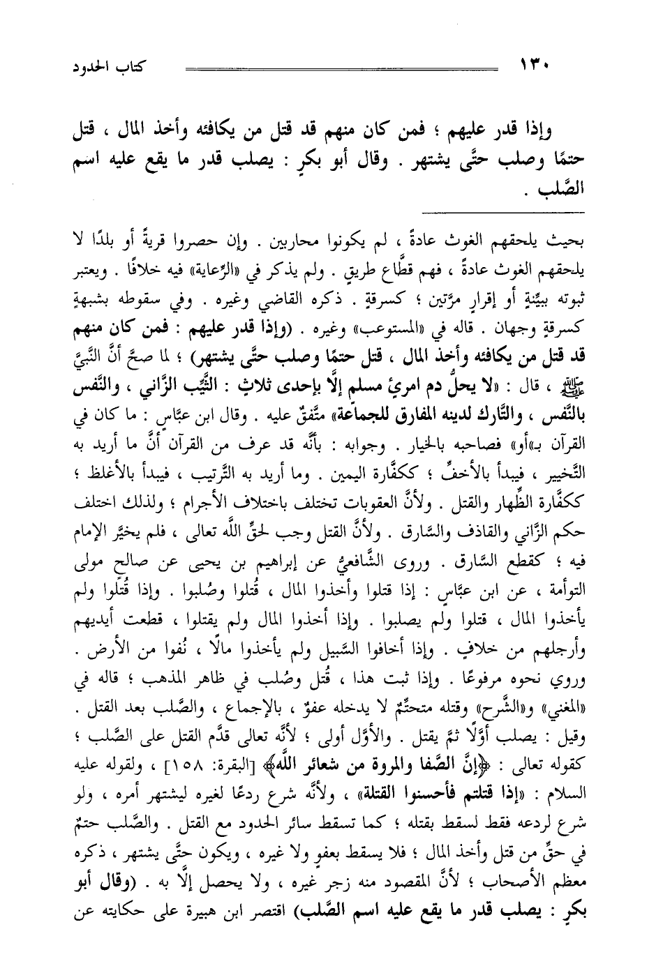 بحيث يلحقهم الغوث عادة لم يكونوا محاربين وإن حصروا قرية أو بلدا لا يلحقهم الغوث عادة فهم قطاع طريق ولم يذكر في الرعاية فيه خلافا ويعتبر ثبوته ببينة أو إقرار مرتين كسرقة ذكره القاضي وغيره وفي سقوطه بشبهة كسرقة وجهان قاله في المستوعب وغيره "وإذا قدر عليهم فمن كان منهم قد قتل من يكافئه وأخذ المال قتل حتما وصلب حتى يشتهر" لما صح أن النبي صلى الله عليه وسلم قال "لا يحل دم امرئ مسلم إلا بإحدى ثلاث الثيب الزاني والنفس بالنفس والتارك لدينه المفارق للجماعة" متفق عليه وقال ابن عباس ما كان في القرآن ب أو فصاحبه بالخيار وجوابه بأنه قد عرف من القرآن أن ما أريد به التخيير فيبدأ بالأخف ككفارة اليمين وما أريد به الترتيب فيبدأ بالأغلظ ككفارة الظهار والقتل ولأن العقوبات تختلف باختلاف الأجرام ولذلك اختلف حكم الزاني والقاذف والسارق ولأن القتل وجب لحق الله تعالى فلم يخير الإمام فيه كقطع السارق وروى الشافعي عن إبراهيم بن يحيى عن صالح مولى التوأمة عن ابن عباس إذا قتلوا وأخذوا المال قتلوا وصلبوا وإذا قتلوا ولم يأخذوا المال قتلوا ولم يصلبوا وإذا أخذوا المال ولم يقتلوا قطعت أيديهم وأرجلهم من خلاف وإذا أخافوا السبيل ولم يأخذوا مالا نفوا من الأرض وروي نحوه مرفوعا وإذا ثبت هذا قتل وصلب في ظاهر المذهب قاله في المغني والشرح وقتله متحتم لا يدخله عفو بالإجماع والصلب بعد القتل وقيل يصلب أولا ثم يقتل والأول أولى لأنه تعالى قدم القتل على الصلب كقوله تعالى {إِنَّ الصَّفَا وَالْمَرْوَةَ مِنْ شَعَائِرِ اللَّهِ} [البقرة: 158] ولقوله عليه السلام "إذا قتلتم فأحسنوا القتلة" ولأنه شرع ردعا لغيره ليشتهر أمره ولو شرع لردعه فقط لسقط بقتله كما تسقط سائر الحدود مع القتل والصلب حتم في حق من قتل وأخذ المال فلا يسقط بعفو ولا غيره ويكون حتى يشتهر ذكره معظم الأصحاب لأن المقصود منه زجر غيره ولا يحصل إلا به "وقال أبو بكر يصلب قدر ما يقع عليه اسم الصلب" اقتصر ابن هبيرة على حكايته عن