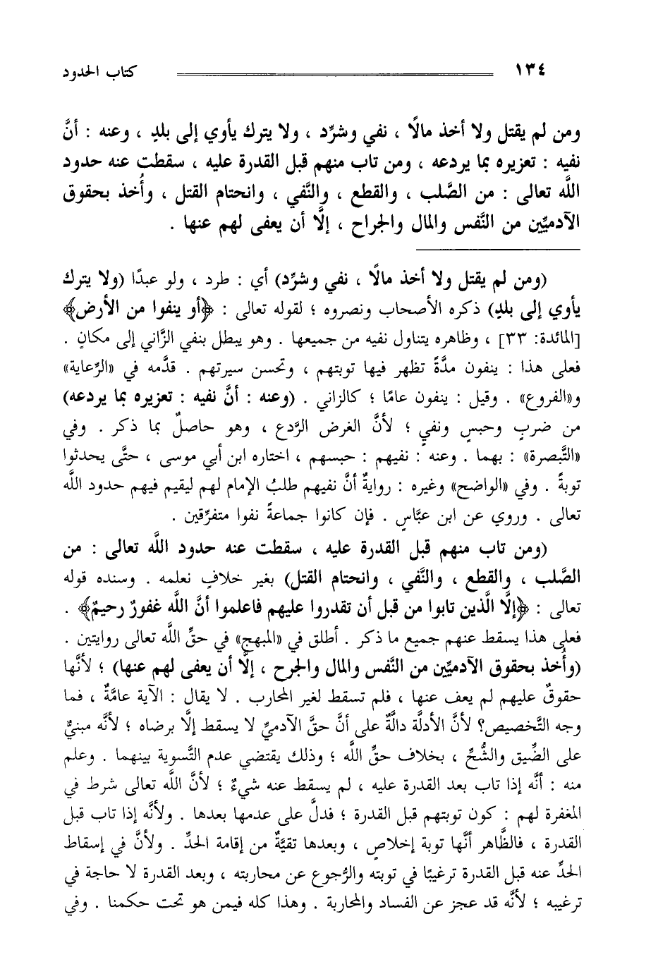 ومن لم يقتل ولا أخذ مالا نفي وشرد ولا يترك يأوي إلى بلد وعنه أن نفيه تعزيره بما يردعه ومن تاب منهم قبل القدرة عليه سقطت عنه حدود الله تعالى من الصلب والقطع والنفي وانحتام القتل وأخذ بحقوق الآدميين من النفس والمال والجراح إلا أن يعفى لهم عنها