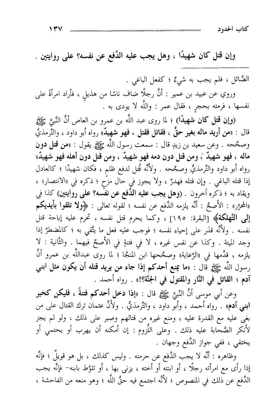 "وإن قتل كان شهيدا" لما روى عبد الله بن عمرو بن العاص أن النبي صلى الله عليه وسلم قال "من أريد ماله بغير حق فقاتل فقتل فهو شهيد" رواه أبو داود والترمذي وصححه وعن سعيد بن زيد قال سمعت رسول الله صلى الله عليه وسلم يقول "من قتل دون ماله فهو شهيد ومن قتل دون دمه فهو شهيد ومن قتل دون أهله فهو شهيد" رواه أبو داود والترمذي وصححه ولأنه قتل لدفع ظلم فكان شهيدا كالعادل إذا قتله الباغي وإن قتله فهدر ولا يجوز في حال مزح ذكره في الانتصار ويقاد به ذكره آخرون "وهل يجب عليه الدفع عن نفسه على روايتين" كذا في المحرر الأصح أنه يلزمه الدفع عن نفسه لقوله تعالى {وَلا تُلْقُوا بِأَيْدِيكُمْ إِلَى التَّهْلُكَةِ} [البقرة: 195] وكما يحرم قتل نفسه تحرم عليه إباحة قتل نفسه ولأنه قدر على إحياء نفسه فوجب عليه فعل ما يتقي به كالمضطر إذا وجد الميتة وكذا عن نفس غيره لا في فتنة في الأصح فيهما والثانية لا يلزمه قدمها في الرعاية وصححها ابن المنجا لما روى عبد الله ابن عمرو أن رسول الله صلى الله عليه وسلم قال "ما يمنع أحدكم إذا جاء من يريد قتله أن يكون مثل ابني آدم القاتل في النار والمقتول في الجنة" رواه أحمد