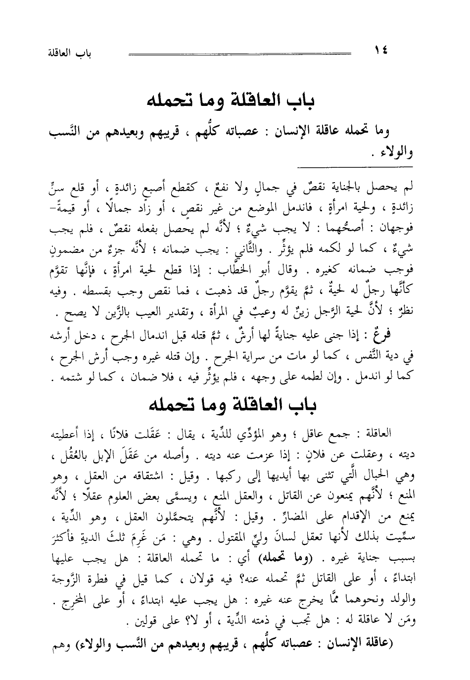وما تحمله عاقلة الإنسان عصباته كلهم قريبهم وبعيدهم من النسب والولاء __________