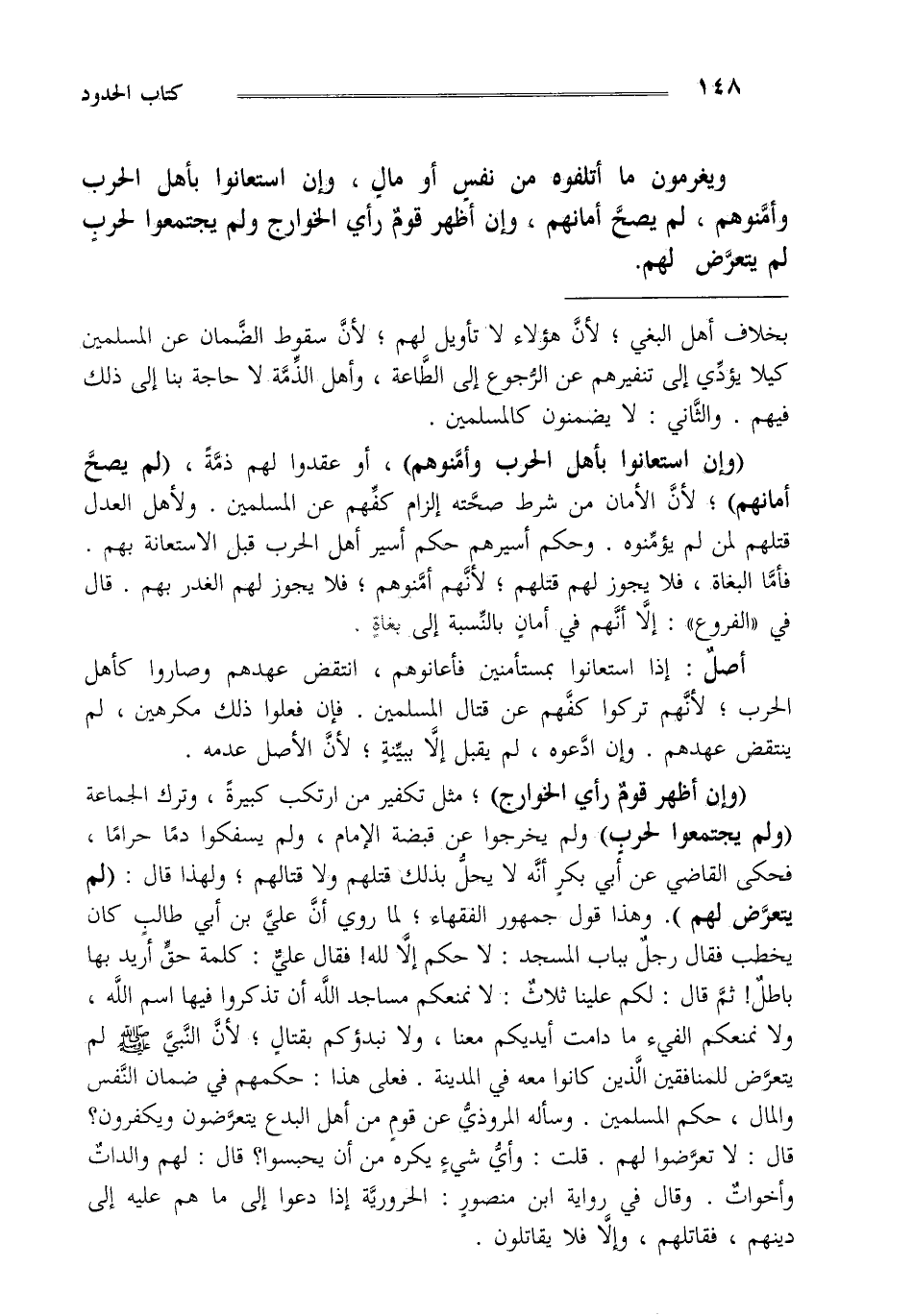 "وإن أظهر قوم رأي الخوارج" مثل تكفير من ارتكب كبيرة وترك الجماعة "ولم يجتمعوا لحرب" ولم يخرجوا عن قبضة الإمام ولم يسفكوا دما حراما فحكى القاضي عن أبي بكر أنه لا يحل بذلك قتلهم ولا قتالهم ولهذا قال "لم يتعرض لهم" وهذا قول جمهور الفقهاء لما روي "أن علي بن أبي طالب كان يخطب فقال رجل بباب المسجد لا حكم إلا لله فقال علي كلمة حق أريد بها باطل ثم قال لكم علينا ثلاث لا نمنعكم مساجد الله أن تذكروا فيها اسم الله ولا نمنعكم الفيء ما دامت أيديكم معنا ولا نبدؤكم بقتال لأن النبي صلى الله عليه وسلم لم يتعرض للمنافقين الذين كانوا معه في المدينة" فعلى هذا حكمهم في ضمان النفس والمال حكم المسلمين وسأله المروذي عن قوم من أهل البدع يتعرضون ويكفرون قال لا تعرضوا لهم قلت وأي شيء يكره من أن يحبسوا قال لهم والدات وأخوات وقال في رواية ابن منصور الحرورية إذا دعوا إلى ما هم عليه إلى دينهم فقاتلهم وإلا فلا يقاتلون .