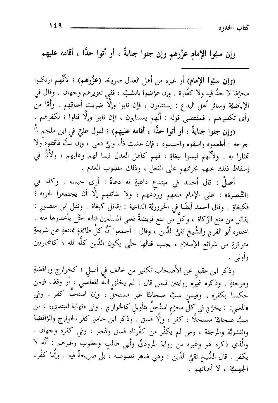 "وإن سبوا الإمام" أو غيره من أهل العدل صريحا "عزرهم" لأنهم ارتكبوا محرما لا حد فيه ولا كفارة وإن عرضوا بالسب ففي تعزيرهم وجهان وقال في الإباضية وسائر أهل البدع يستتابون فإن تابوا وإلا ضربت أعناقهم وأما من رأى تكفيرهم فمقتضى قوله أنهم يستتابون فإن تابوا وإلا قتلوا لكفرهم "وإن جنوا جناية أو أتوا حدا أقامه عليهم" لقول علي في ابن ملجم لما جرحه أطعموه واسقوه واحبسوه فإن عشت فأنا ولي دمي وإن مت فاقتلوه ولا تمثلوا به ولأنهم ليسوا ببغاة فهم كأهل العدل فيما لهم وعليهم ولأن في إسقاط ذلك عنهم تجرئتهم على الفعل وذلك مطلوب العدم