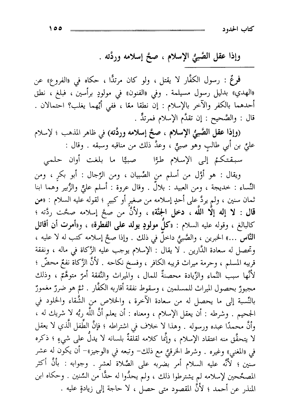 "وإذا عقل الصبي الإسلام صح إسلامه وردته" في ظاهر المذهب لإسلام علي بن أبي طالب وهو صبي وعد ذلك من مناقبه وسبقه وقال